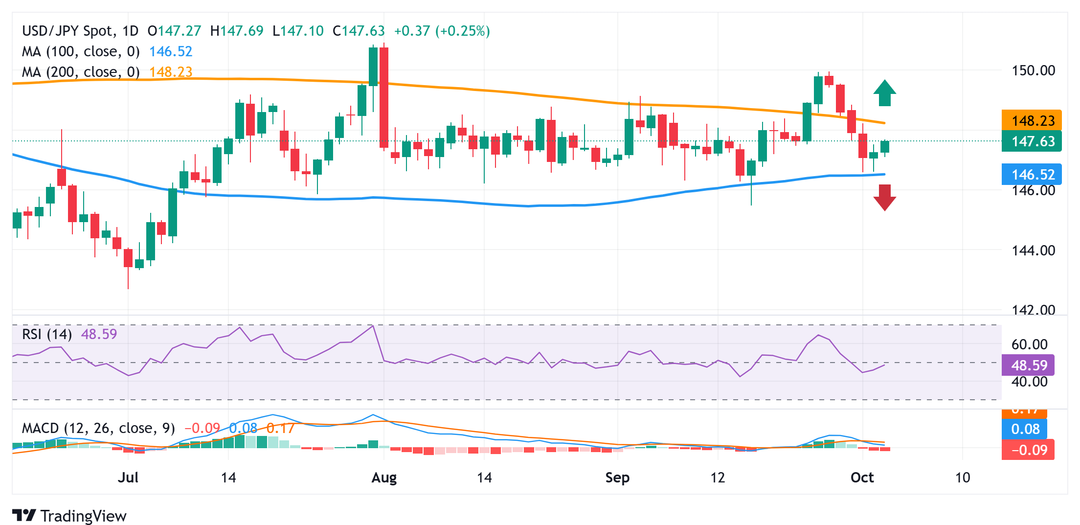 Cặp USD/JPY đã cho thấy sự kiên cường dưới mức 147,00 và bật lên từ mức hỗ trợ Đường trung bình động giản đơn (SMA) 100 ngày gần khu vực 146,60-146,55 trong ngày thứ hai liên tiếp vào thứ Năm. Sự di chuyển tiếp theo lên trên ủng hộ các nhà giao dịch theo xu hướng tăng. Tuy nhiên, các chỉ báo dao động trên biểu đồ hàng ngày mới bắt đầu có lực kéo tiêu cực, điều này, theo đó, ủng hộ cho việc xuất hiện một số bán ra gần mức 148,00.