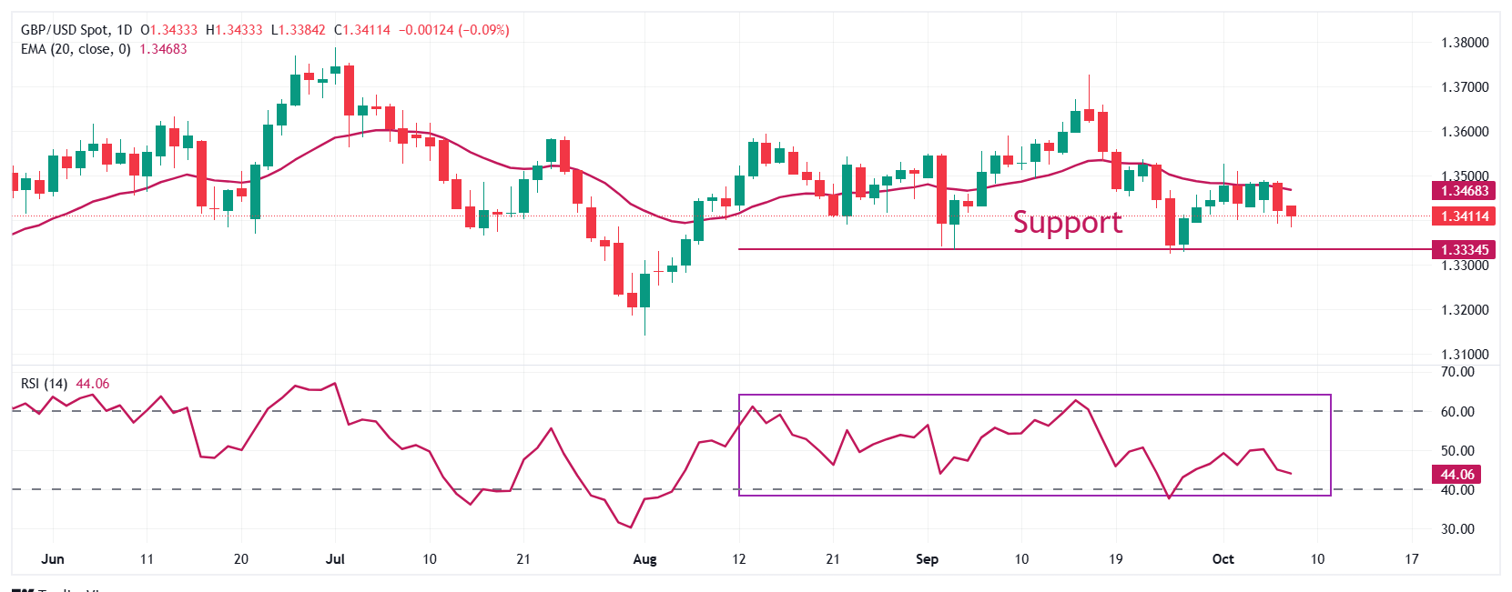 Đồng bảng Anh hoạt động kém hơn so với Đô la Mỹ và giảm xuống gần 1,3400 vào thứ Tư. Cặp GBP/USD vẫn dưới đường trung bình động hàm mũ (EMA) 20 ngày, giao dịch quanh mức 1,3468, cho thấy xu hướng ngắn hạn là giảm giá.