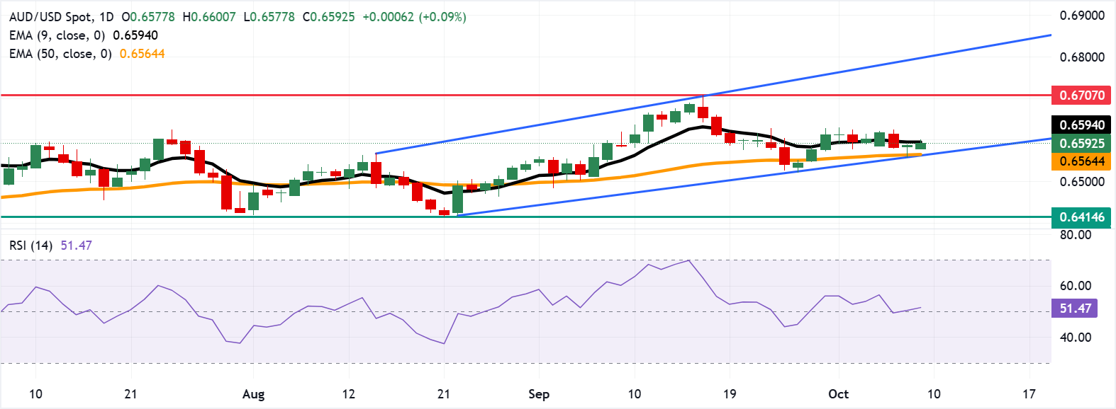 Cặp AUD/USD đang giao dịch quanh mức 0,6600 vào thứ Năm. Phân tích kỹ thuật trên khung thời gian hàng ngày cho thấy cặp này vẫn nằm trong kênh tăng, cho thấy xu hướng tăng bền vững. Thêm vào đó, Chỉ số Sức mạnh Tương đối (RSI) 14 ngày được định vị trên mức 50, củng cố xu hướng tăng.