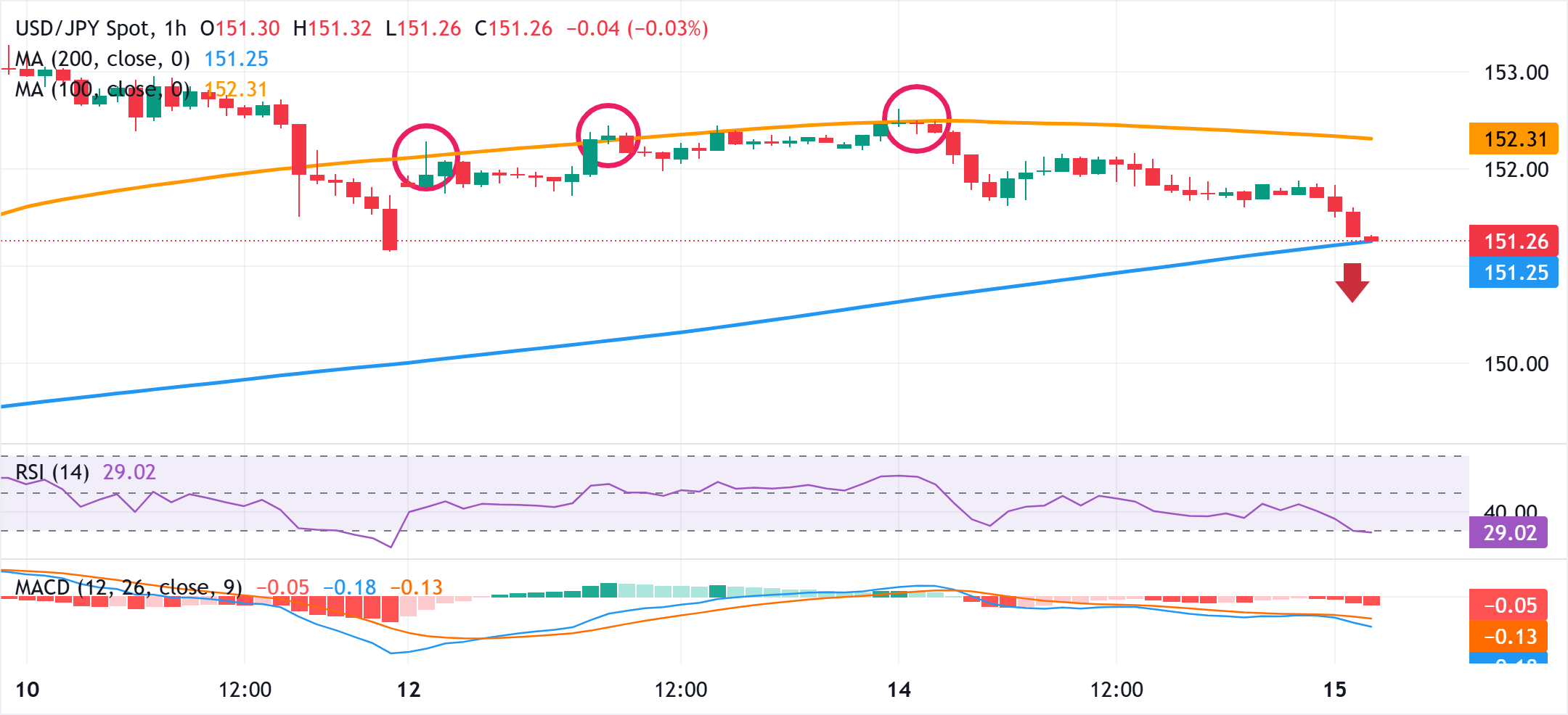 Những thất bại lặp đi lặp lại trong tuần này để vượt qua đường SMA 100 giờ và sự suy giảm tiếp theo cho thấy đà giảm giá cho USD/JPY. Tuy nhiên, các chỉ báo tích cực trên biểu đồ hàng ngày cho thấy hỗ trợ có thể xuất hiện gần đường SMA 200 giờ quanh mức 151,20. Một sự phá vỡ dưới mức này có thể mở đường cho mốc 151,00 trên đường đến mức hỗ trợ trung gian 150,70 và mốc tâm lý 150,00.