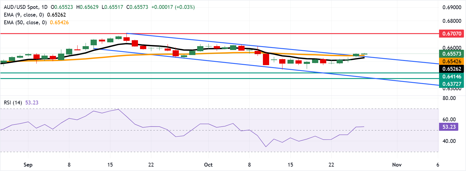 AUD/USD đang giao dịch quanh mức 0,6560 vào thứ Ba. Phân tích kỹ thuật trên biểu đồ hàng ngày cho thấy một sự đảo chiều tăng giá khi cặp tiền này được định vị hơi trên ranh giới trên của kênh giảm dần. Cặp tiền này cũng đang giao dịch trên các đường trung bình động hàm mũ (EMA) 9 và 50 ngày, cho thấy rằng cả động lực giá ngắn hạn và trung hạn đều vẫn mạnh.