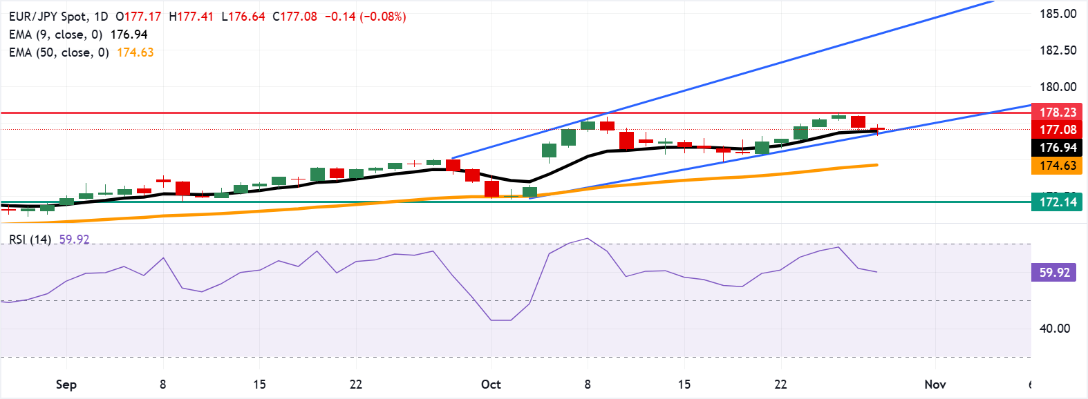 Cặp EUR/JPY đang kiểm tra mức hỗ trợ ngay lập tức tại mức tâm lý 177,00, tiếp theo là đường EMA 9 ngày ở mức 176,94 và ranh giới dưới của kênh tăng dần quanh mức 176,80. Việc phá vỡ dưới vùng hỗ trợ hợp lưu này sẽ làm suy yếu động lực tăng giá ngắn hạn, có khả năng tạo áp lực giảm đối với cặp tiền tệ này hướng tới khu vực EMA 50 ngày gần 174,63. Sự giảm giá thêm sẽ khiến cặp tiền tệ này tiếp cận mức thấp nhất trong bảy tuần là 172,14, được ghi nhận vào ngày 9 tháng 9.