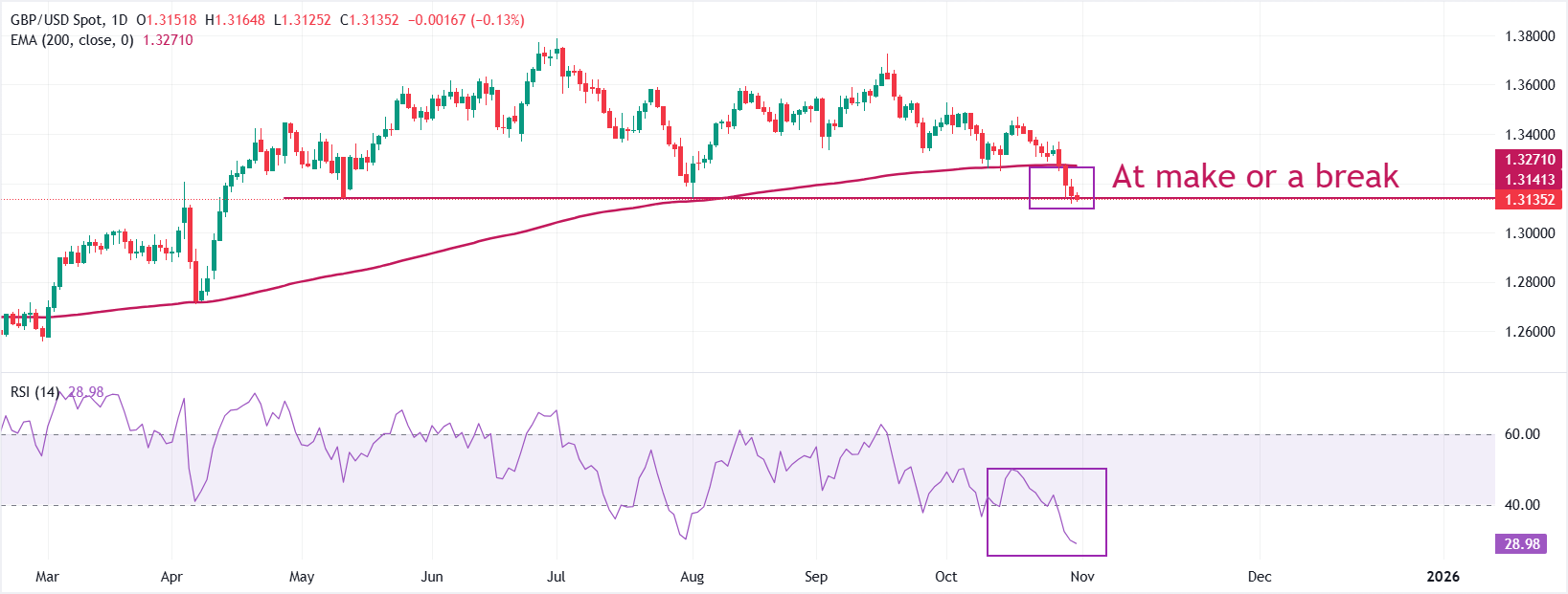 Đồng bảng Anh giao dịch yếu ớt so với Đô la Mỹ gần mức đáy hơn sáu tháng khoảng 1,3115 được ghi nhận vào thứ Năm. Triển vọng của cặp tiền này vẫn giảm khi nó giao dịch dưới đường trung bình động hàm mũ (EMA) 200 ngày, hiện ở mức khoảng 1,3270.