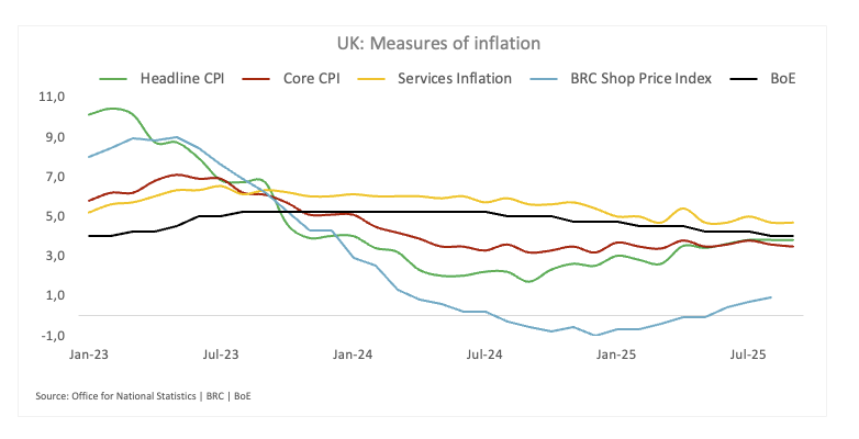 Dữ liệu mới từ Văn phòng Thống kê Quốc gia cho thấy lạm phát CPI chính tăng lên 3,8% trong tháng 9, trong khi lạm phát lõi (không bao gồm thực phẩm và năng lượng) giảm nhẹ xuống 3,5%. Lạm phát dịch vụ, thường được BoE theo dõi chặt chẽ, vẫn cứng đầu ở mức 4,7%, cho thấy áp lực giá cơ bản chưa hoàn toàn giảm.