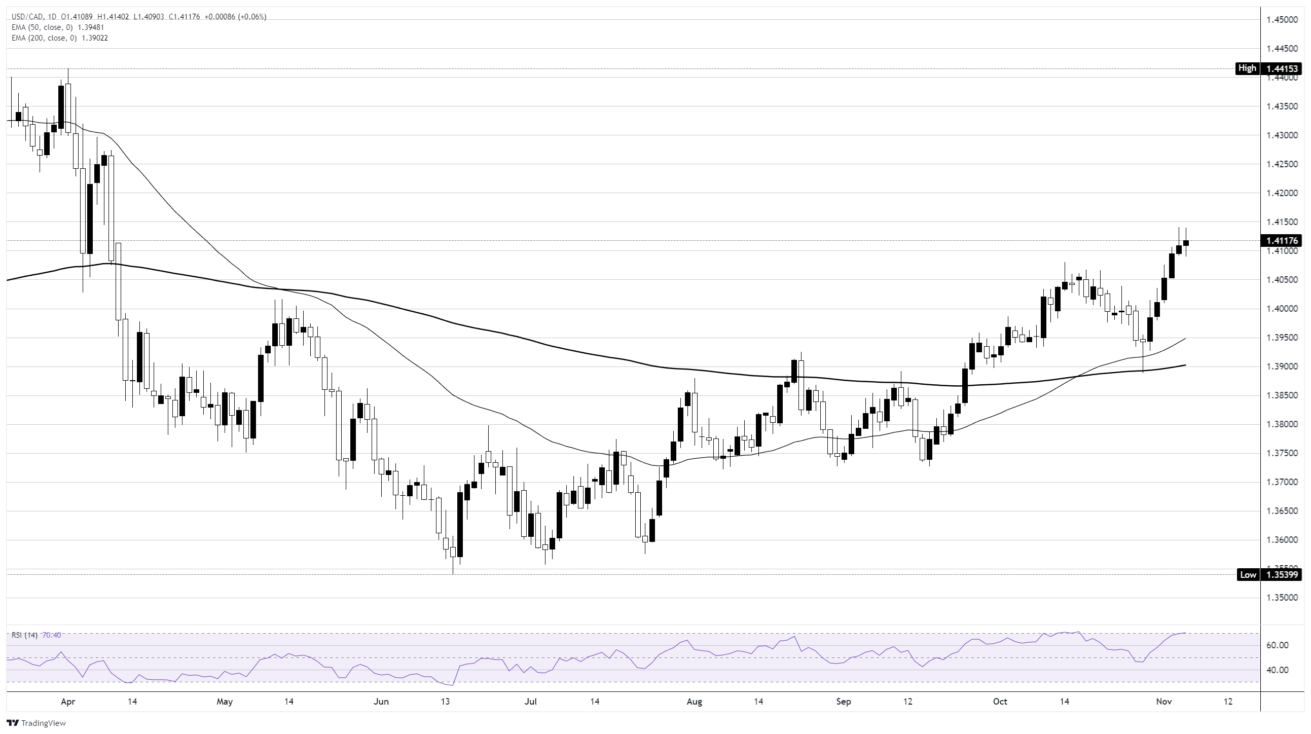 USD/CAD tiếp tục đà tăng mạnh, đóng cửa gần 1,4120 sau một đợt tăng giá một chiều theo sau một sự phục hồi kỹ thuật từ đường trung bình động hàm mũ (EMA) 200 ngày gần 1,3900. Cặp tiền này đã ghi nhận một chuỗi liên tiếp các đỉnh cao hơn và đáy cao hơn kể từ cuối tháng 9, phản ánh nhu cầu đồng đô la Mỹ vững chắc so với đồng đô la Canada.