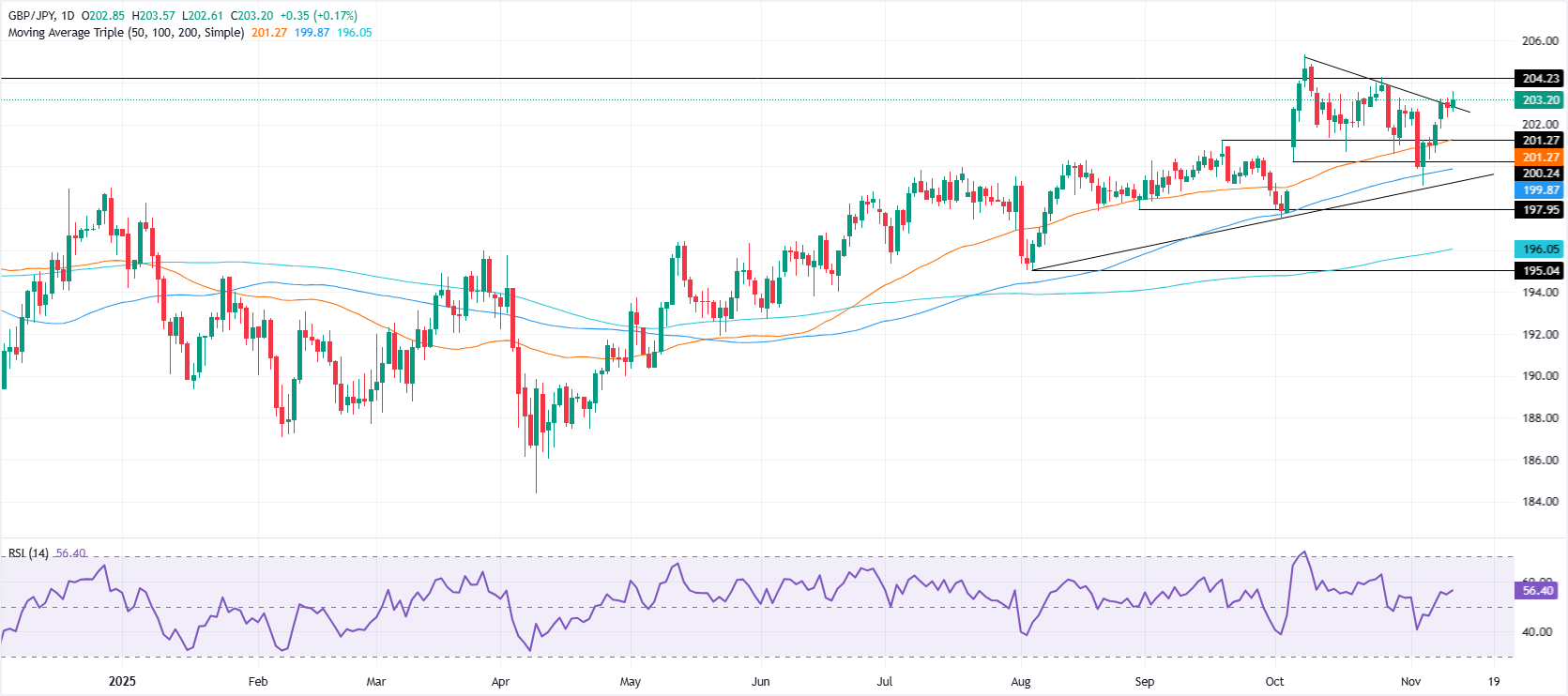 Một sự đảo chiều mạnh dưới SMA 20 ngày tại 202,45 có thể đẩy GBP/JPY hướng tới SMA 50 ngày tại 201,35.