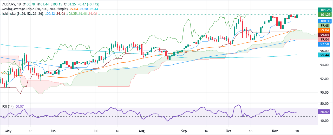 Bức tranh kỹ thuật của AUD/JPY cho thấy rằng có khả năng tăng thêm. Chuỗi các mức cao và thấp hơn liên tiếp cho thấy cặp tiền này có thể thách thức đỉnh năm 101,82.
