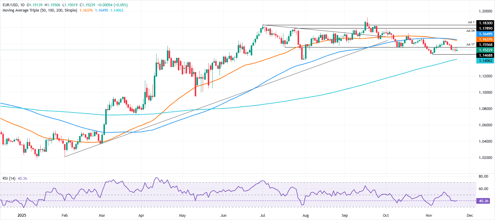 EUR/USD đã hạn chế sự giảm giá vào thứ Hai, lơ lửng gần mức 1,1520 sau khi đạt mức thấp hàng ngày gần 1,1500. Tuy nhiên, xu hướng giảm vẫn còn nguyên vẹn, được xác nhận bởi Chỉ số Sức mạnh Tương đối (RSI), vẫn dưới mức 50 trung lập.
