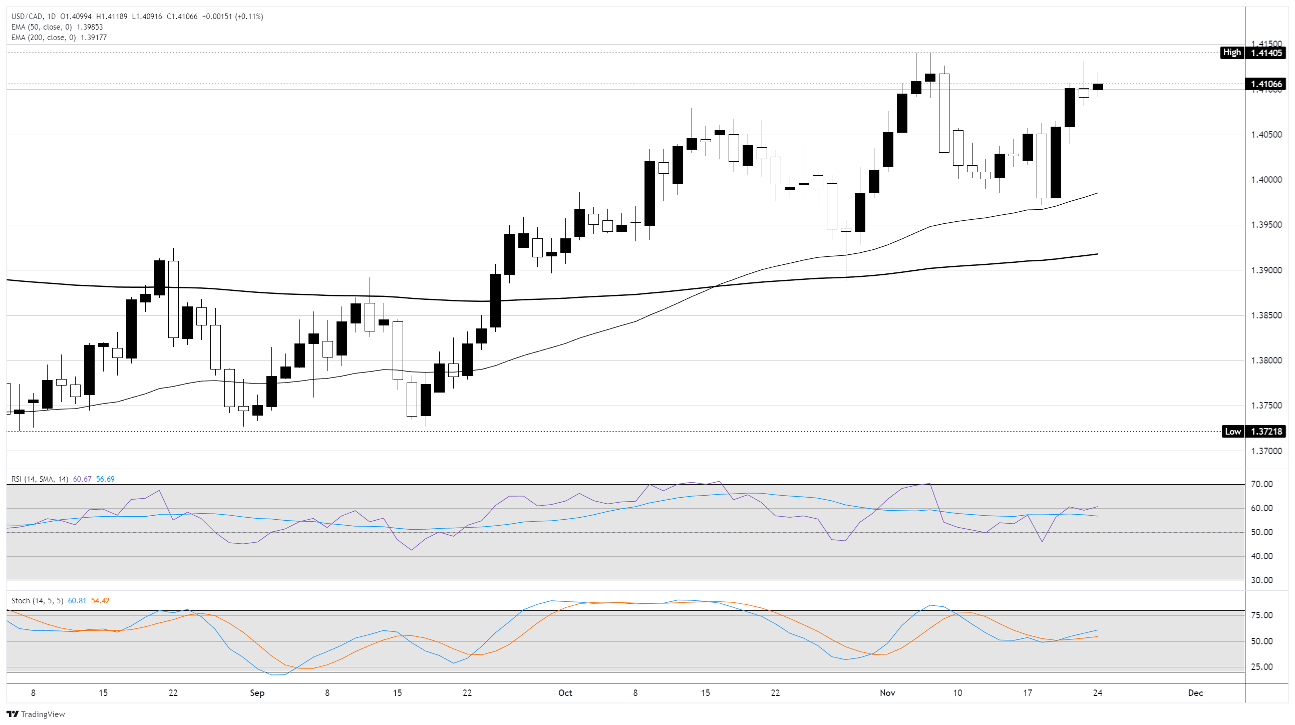 USD/CAD tiếp tục tăng cao hơn sau khi bảo vệ đường trung bình động hàm mũ (EMA) 50 ngày đang tăng gần 1,3980. Người mua đã nhanh chóng tham gia sau đợt giảm giá của tuần trước, hình thành một mức đáy cao hơn giữ cho đà tăng tổng thể được duy trì. Giá hiện đang kiểm tra vùng 1,4100 đến 1,4150, đã hoạt động như một mức kháng cự cứng đầu kể từ đầu tháng 11. Một mức đóng cửa hàng ngày trên 1,4150 sẽ xóa bỏ trần gần đây và mở đường cho mức cao tháng 11 gần 1,4200.