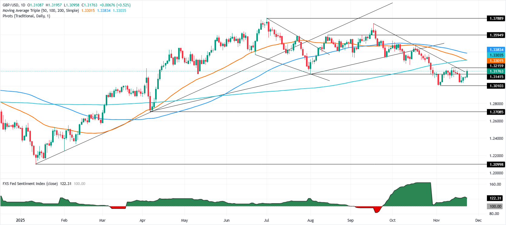 GBP/USD vẫn có xu hướng giảm, mặc dù một sự bứt phá quyết định trên mức cao nhất ngày 15 tháng 11 là 1,3215 có thể mở đường thách thức hợp lưu của các đường trung bình động giản đơn (SMA) 50 và 200 ngày tại 1,3299/1,3300. Ngược lại, một sự giảm xuống dưới đường SMA 20 ngày tại 1,3130 có thể đẩy cặp này về phía 1,3100.