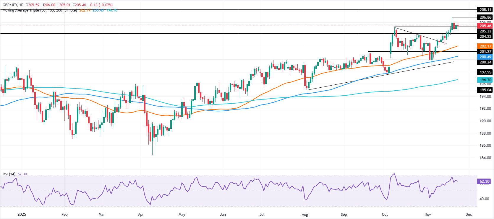 GBP/JPY củng cố trong phiên giao dịch thứ Ba khi đồng yên Nhật (JPY) tăng giá do những đe dọa về sự can thiệp có thể xảy ra của BoJ vào thị trường FX, và cũng khi các nhà giao dịch đồng bảng Anh chờ đợi việc công bố ngân sách tài chính của Vương quốc Anh. Tại thời điểm viết bài, cặp tiền này giao dịch ở mức 205,44, giảm 0,08%.