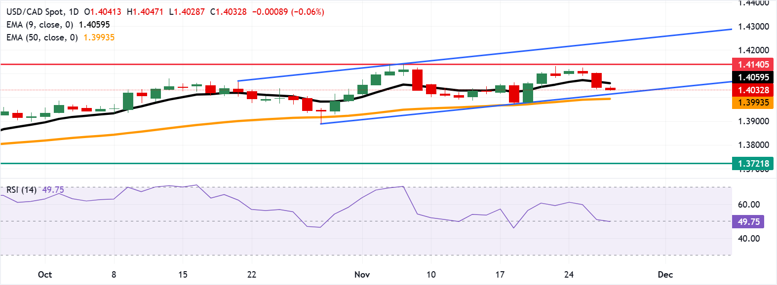 USD/CAD kéo dài mức lỗ trong phiên thứ ba liên tiếp, giao dịch quanh mức 1,4030 trong giờ châu Á vào thứ Năm. Thiết lập kỹ thuật trên biểu đồ hàng ngày phản ánh một xu hướng tăng giá liên tục, với cặp tiền này vẫn nằm trong mô hình kênh tăng dần của nó.