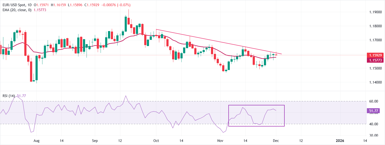 Trên biểu đồ hàng ngày, EUR/USD giao dịch ở mức 1,1593. Đường trung bình động 20 kỳ (20-EMA) đã ổn định quanh mức 1,1577, với giá giữ trên mức này một chút và một sự tăng nhẹ cho thấy xu hướng ngắn hạn đang cải thiện. Đường xu hướng giảm từ 1,1776 hạn chế các đợt tăng, mức kháng cự được nhìn thấy gần 1,1606. Chỉ số RSI ở mức 51,8 (trung lập) phản ánh động lực cân bằng sau một đợt phục hồi giữa tháng.