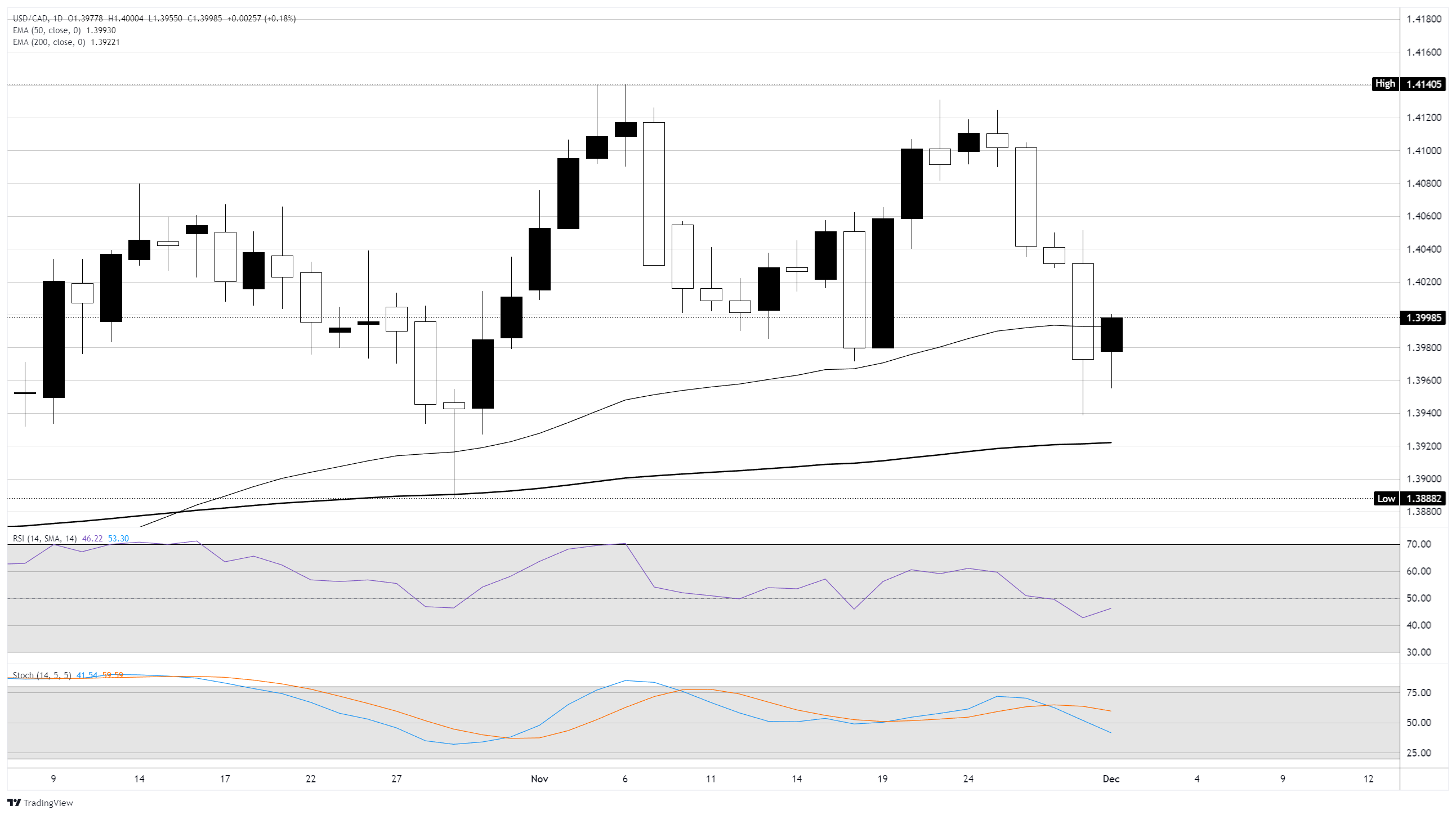 Đồng đô la Canada (CAD) đã khởi đầu tháng giao dịch tháng 12 với nền tảng yếu, chấm dứt chuỗi thắng bốn phiên và dừng lại gần các đường trung bình động chính so với đồng đô la Mỹ (USD). Tâm lý tránh rủi ro đã tạo ra áp lực đặt giá thầu mới dưới đồng bạc xanh, đẩy USD/CAD trở lại một chiến trường kỹ thuật gần ngưỡng giá 1,4000.