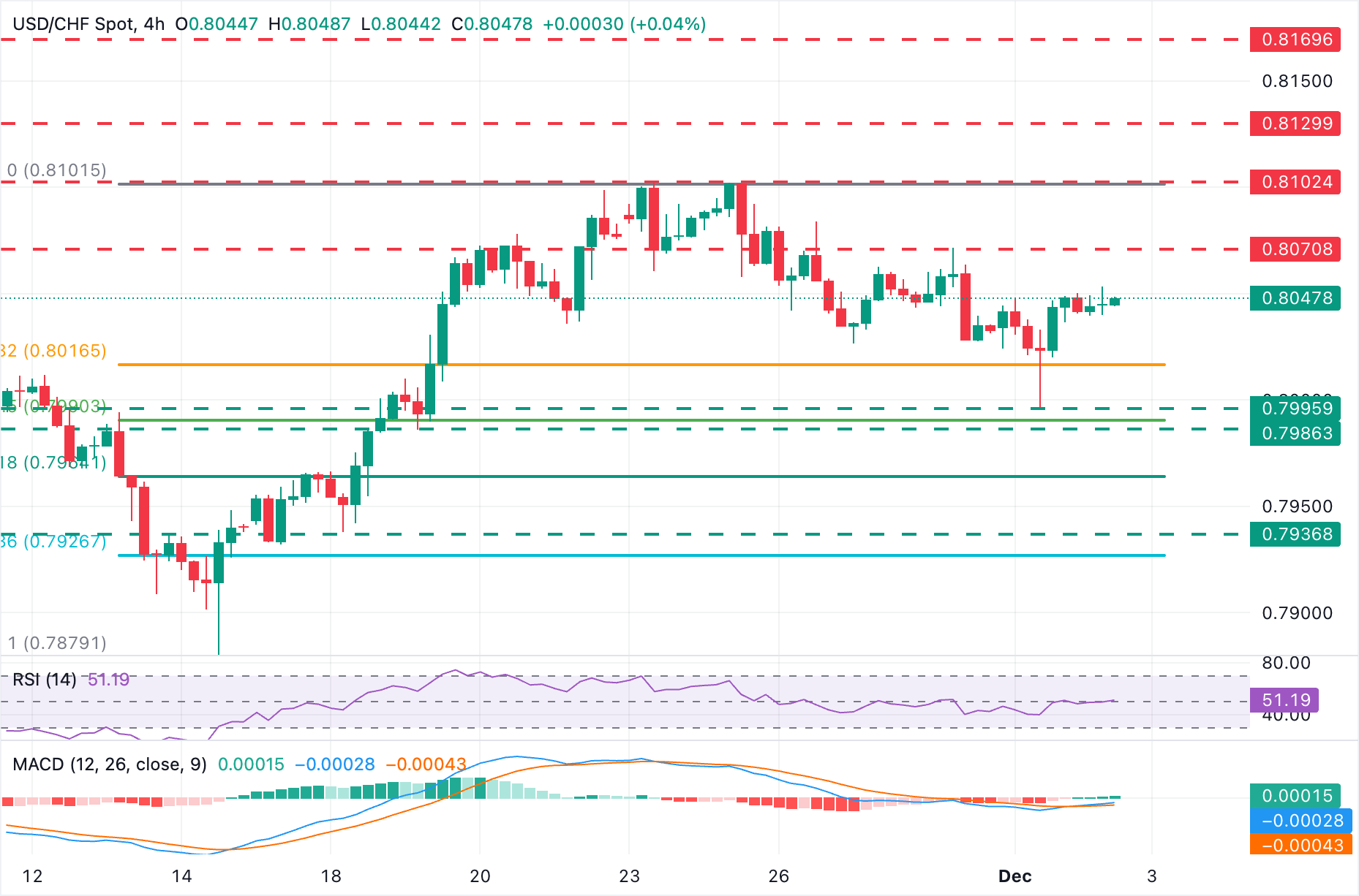 Cặp USD/CHF giao dịch ở mức 0,8044, gần như không thay đổi trên biểu đồ hàng ngày. Chỉ báo Phân kỳ hội tụ trung bình động (MACD) đã chuyển sang tích cực một cách nhẹ nhàng và giữ quanh đường 0, cho thấy đà tăng giá tạm thời khi đường MACD vượt lên trên đường tín hiệu. Chỉ số sức mạnh tương đối (RSI) vẫn dao động quanh đường 50, cho thấy thiếu một xu hướng rõ ràng.