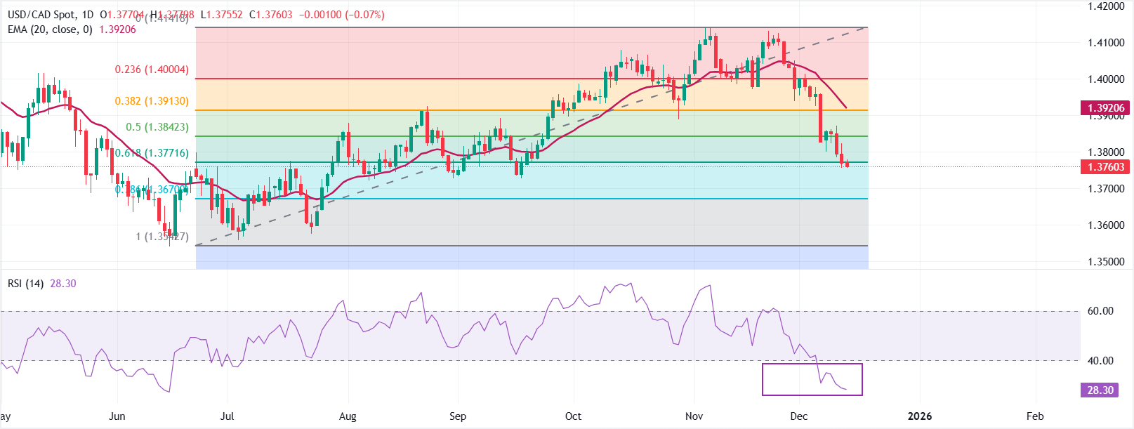 Trong biểu đồ hàng ngày, USD/CAD giao dịch ở mức 1,3760. Cặp này nằm dưới đường trung bình động 20 ngày giảm dần ở mức 1,3921, giữ cho xu hướng ngắn hạn giảm giá và giới hạn các đợt phục hồi. RSI ở mức 28 (quá bán) cho thấy điều kiện giảm giá kéo dài. Đo từ mức thấp 1,3543 đến mức cao 1,4142, mức hồi phục 61,8% ở 1,3772 cung cấp hỗ trợ tạm thời. Một sự đóng cửa dưới mức này sẽ mở ra mức hồi phục 78,6% ở 1,3671.