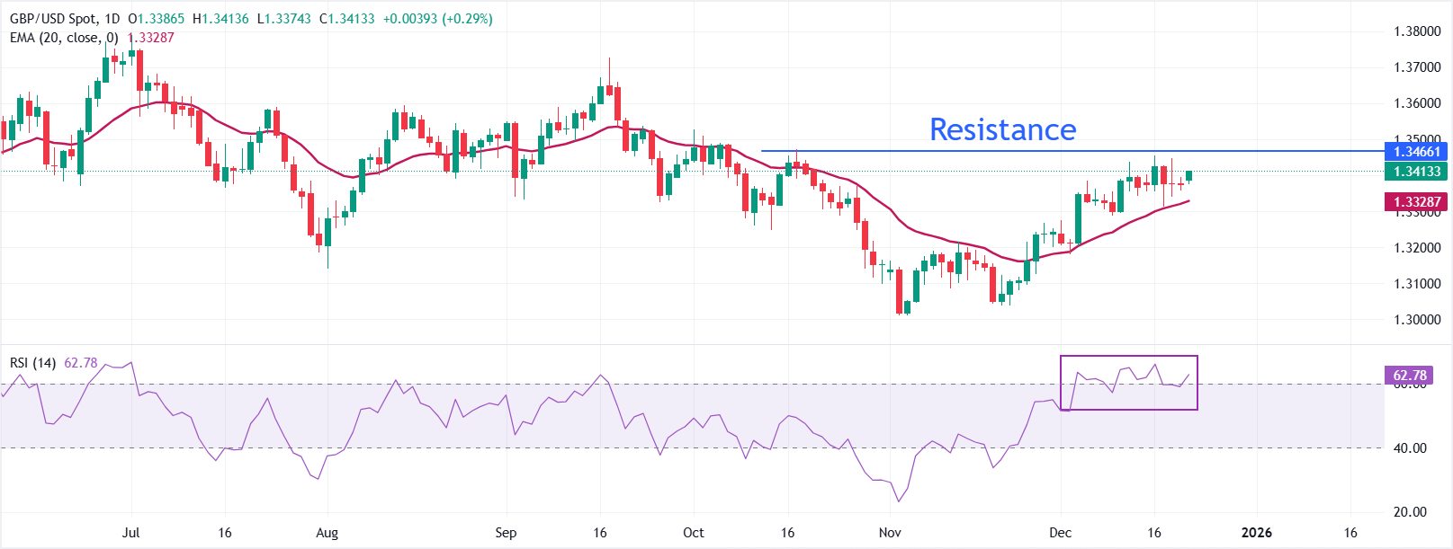GBP/USD giao dịch cao hơn ở mức 1,3415 vào đầu tuần. Đường trung bình động hàm mũ (EMA) 20 ngày dốc lên, củng cố xu hướng tăng khi giá giữ trên mức trung bình rõ ràng. Việc giữ vững trên đường EMA 20 ngày ở mức 1,3329 giữ cho triển vọng tăng giá không bị thay đổi.