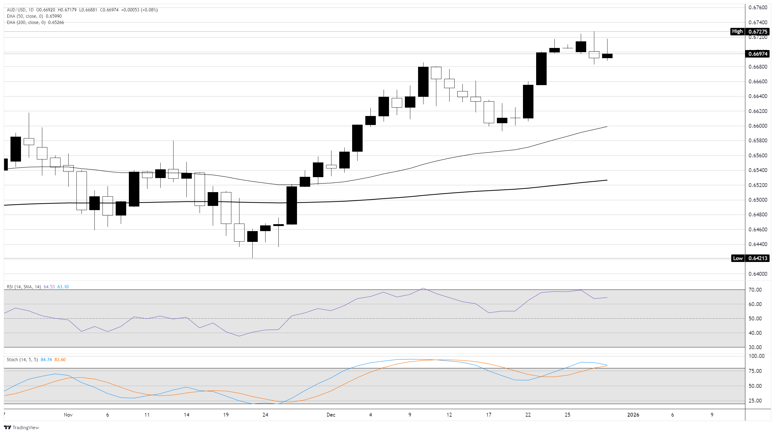 AUD/USD đã giữ mốc 0,6700 trong ngày thứ hai liên tiếp khi cặp đô la Úc vật lộn với khối lượng giao dịch cuối năm hạn chế động lượng tổng thể. Đồng đô la Úc đang có xu hướng tăng khi Ngân hàng Dự trữ Úc (RBA) tiến gần đến một chu kỳ tăng lãi suất mới, trong khi đồng đô la Mỹ (USD) chịu áp lực trên toàn cầu từ Cục Dự trữ Liên bang (Fed) ôn hòa, sẵn sàng cắt giảm lãi suất thêm trong năm 2026.