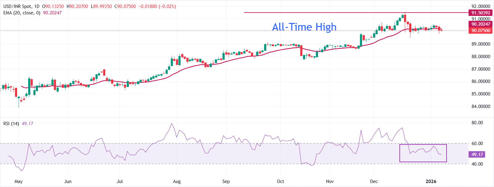 USD/INR tăng lên gần 90,20 khi mở cửa vào thứ Năm. Cặp tiền này nằm dưới Đường trung bình động hàm mũ (EMA) 20 ngày ở mức 90,2025, đã phẳng và bắt đầu lăn xuống, hạn chế các đợt phục hồi. Khi nằm dưới mức đó, xu hướng ngắn hạn trở nên yếu hơn.