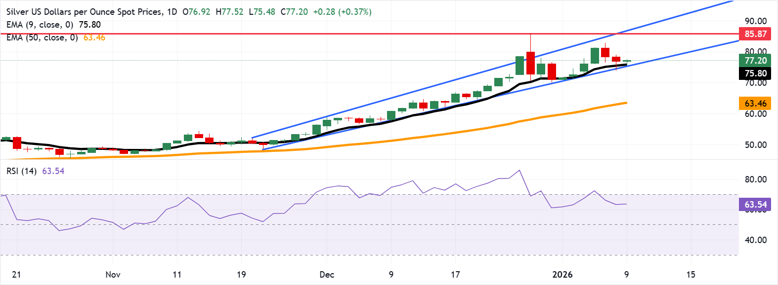 Động lượng đã giảm từ các mức quá mua, nhưng cấu hình EMA tăng vẫn giữ vững với các đợt thoái lui được giữ trên mức trung bình ngắn hạn. Giá bạc giữ trên các đường trung bình động hàm mũ 9 và 50 ngày, bảo tồn xu hướng tăng.