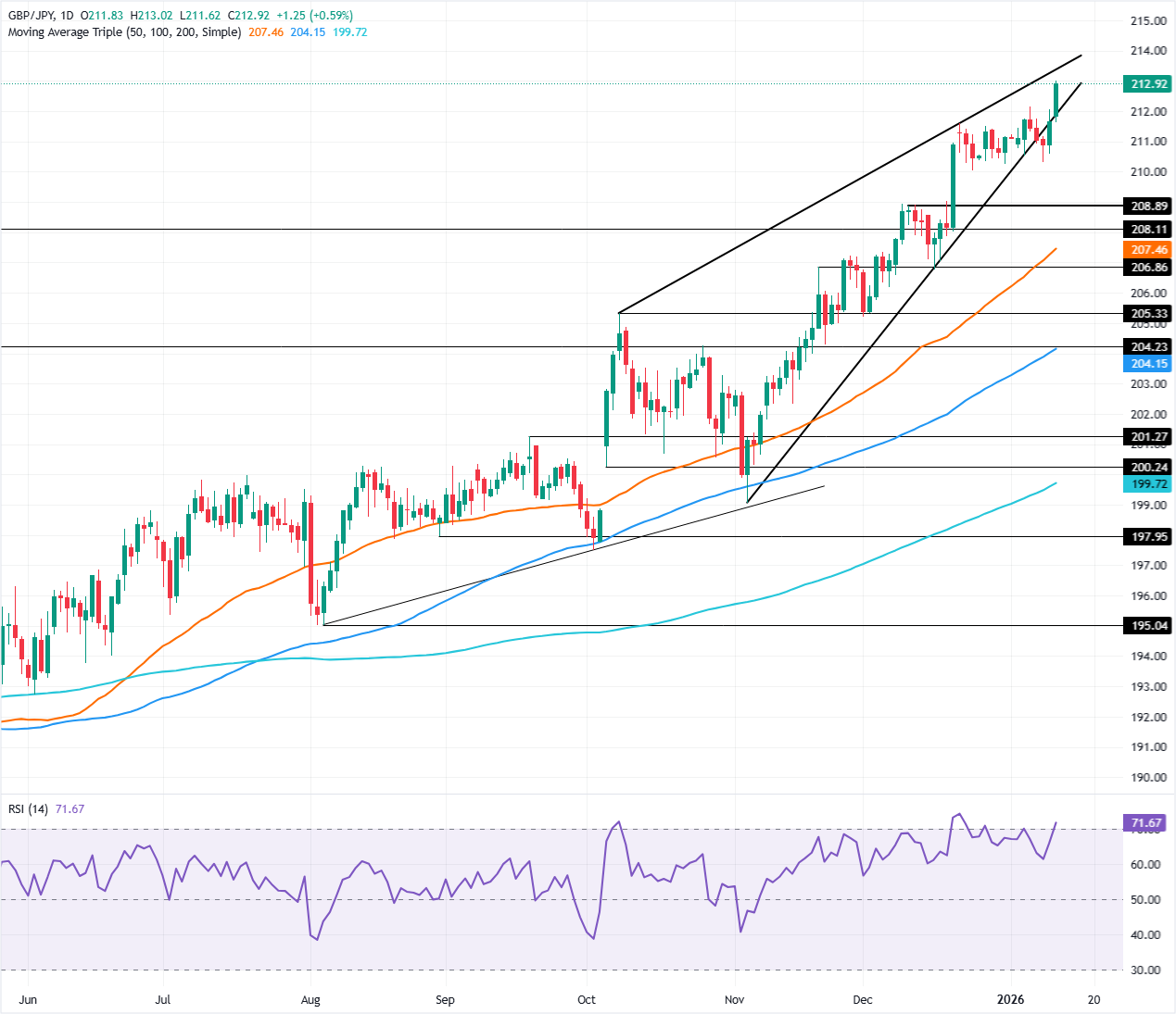 GBP/JPY tăng vào thứ Hai, nhờ vào tâm lý ngại rủi ro đã ảnh hưởng đến các đồng tiền trú ẩn an toàn như đồng Yên Nhật và Đô la, đang giao dịch yếu hơn so với hầu hết các loại tiền tệ khác. Tại thời điểm viết bài, cặp tiền này giao dịch ở mức 212,88, tăng 0,61%.