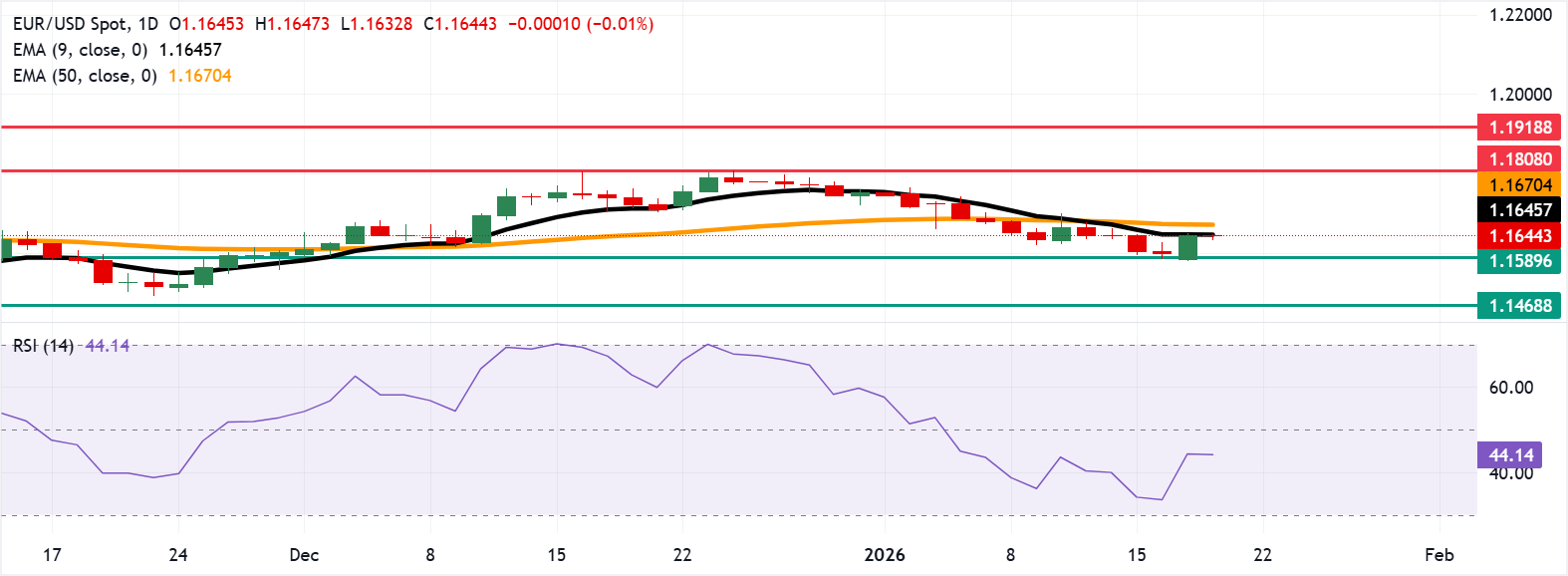 Dưới đường EMA chín ngày và EMA 50 ngày, các đợt tăng sẽ vẫn bị giới hạn, và việc đóng cửa dưới mức đáy bảy tuần tại 1,1589, được thiết lập vào ngày 1 tháng 12, sẽ mở ra cánh cửa đến mức hỗ trợ tiếp theo quanh 1,1468, mức thấp nhất kể từ tháng 8 năm 2025.