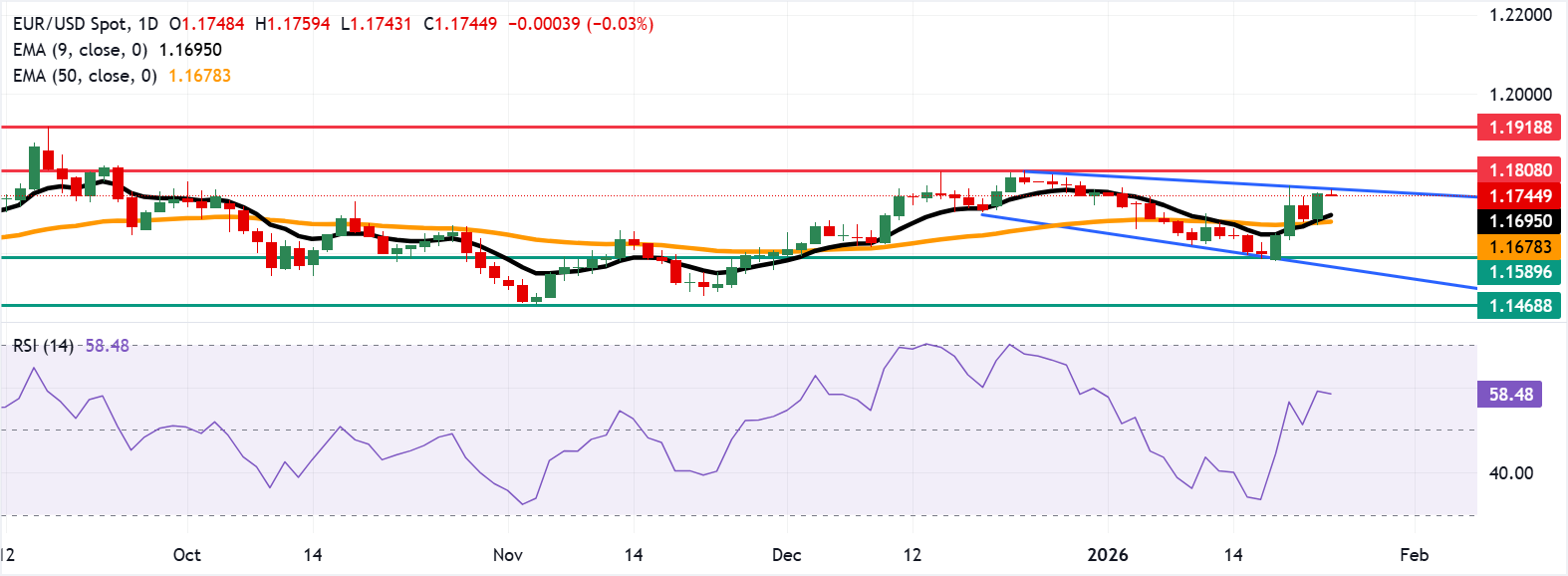 EUR/USD giảm nhẹ sau khi ghi nhận mức tăng trên 0,5% trong phiên trước, giao dịch quanh mức 1,1740 trong giờ châu Á vào thứ Sáu. Phân tích kỹ thuật của biểu đồ hàng ngày cho thấy cặp tiền này vẫn gần ranh giới trên của mô hình kênh giảm dần, cho thấy khả năng đảo chiều tăng giá.