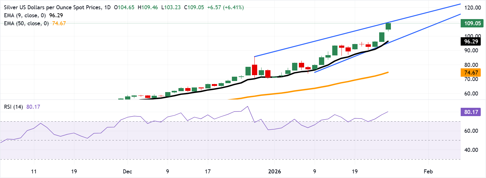Giá bạc (XAG/USD) tiếp tục tăng trong phiên giao dịch thứ ba liên tiếp, giao dịch quanh mức 108,80$ mỗi troy ounce trong giờ châu Á vào thứ Hai. Cặp XAG/USD đã đạt mức cao mới 109,46$ trong bối cảnh xu hướng tăng giá liên tục, được chỉ ra bởi phân tích kỹ thuật của khung thời gian biểu đồ hàng ngày, khi giá của kim loại quý này tăng trong mô hình kênh tăng dần.