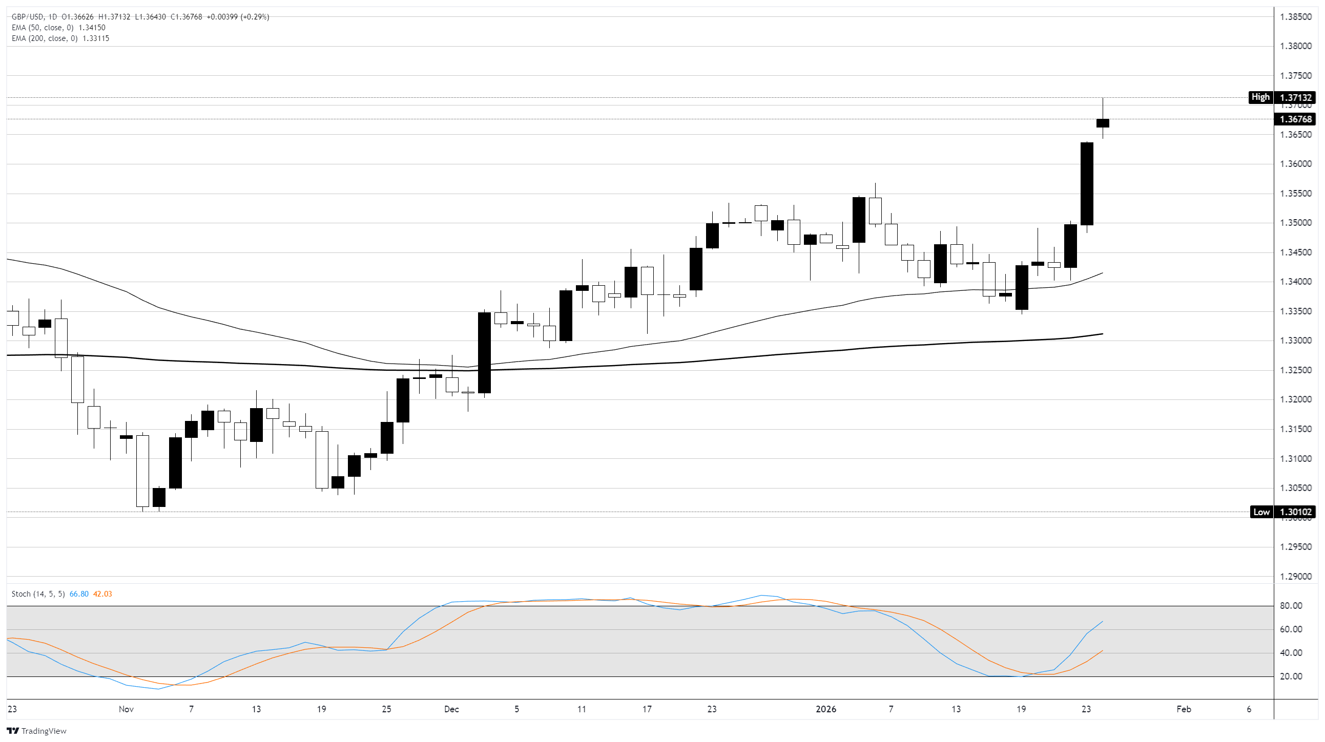 GBP/USD đang trên đường vào vùng quá mua, chạm mức cao nhất trong bốn tháng vào thứ Hai tại ngưỡng 1,3700 và ghi nhận một hiệu suất mạnh mẽ trong tháng Giêng khi đồng đô la Mỹ tiếp tục suy yếu. Sẽ cần một đợt giảm mạnh để đẩy giá mua Cable trở lại vào khoảng giữa, với Đường trung bình động hàm mũ (EMA) 50 ngày đang ở gần khu vực 1,3400.