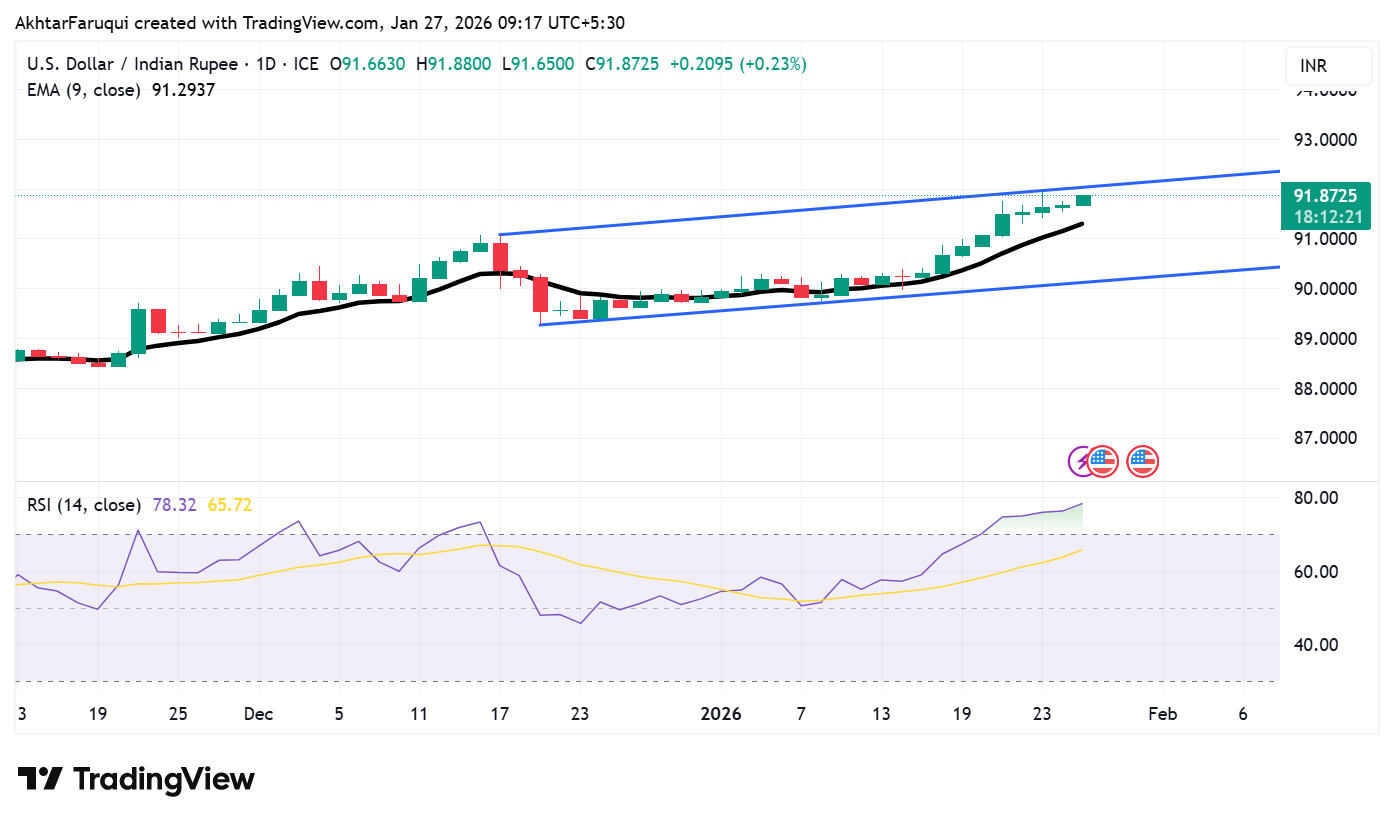 Mức kháng cự ngay lập tức nằm ở mức cao nhất mọi thời đại là 91,96, được ghi nhận vào ngày 23 tháng 1, tiếp theo là ranh giới trên của kênh tăng ở khoảng 92,10. Ở phía giảm, đường trung bình động hàm mũ (EMA) 9 ngày ở mức 91,28 có thể đóng vai trò là mức hỗ trợ chính. Một sự phá vỡ dưới mức trung bình ngắn hạn sẽ làm lộ khu vực quanh kênh tăng thấp hơn ở mức 90,20.