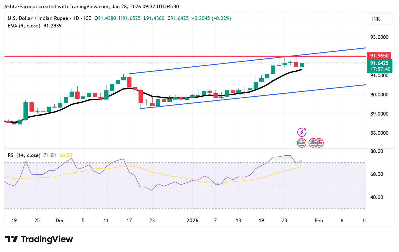 Kháng cự ngay lập tức được nhìn thấy tại mức cao nhất mọi thời đại 91,96 vào ngày 23 tháng 1, tiếp theo là ranh giới trên của kênh tăng gần 92,10. Ở phía giảm, đường trung bình động hàm mũ (EMA) 9 ngày ở mức 91,29 đóng vai trò là hỗ trợ ban đầu, trong khi việc phá vỡ dưới mức này có thể làm lộ ra hỗ trợ kênh dưới khoảng 90,20.