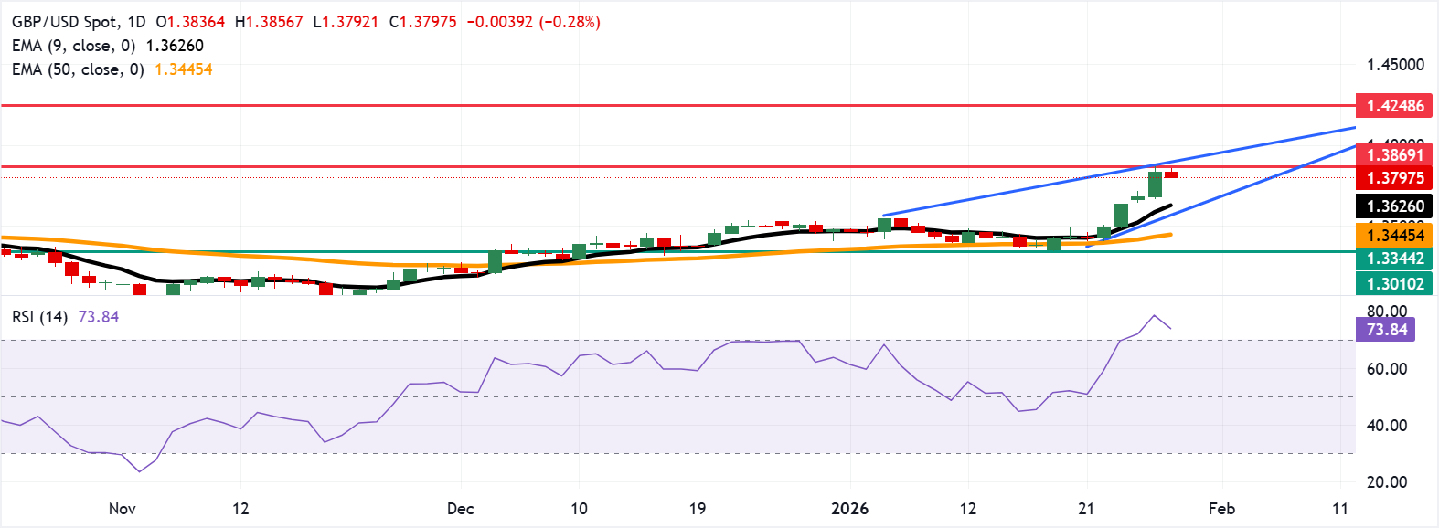 Cặp GBP/USD giữ trên đường trung bình động hàm mũ (EMA) chín ngày và EMA 50 ngày, củng cố xu hướng tăng giá. Đường trung bình ngắn hạn tăng và mở rộng khoảng cách so với độ dốc trung hạn, chỉ ra sức mạnh xu hướng vững chắc. Các đợt giảm có thể được giữ trong khi giá tôn trọng đường trung bình ngắn hạn đang tăng, với xu hướng rộng hơn được hỗ trợ bởi EMA trung hạn.