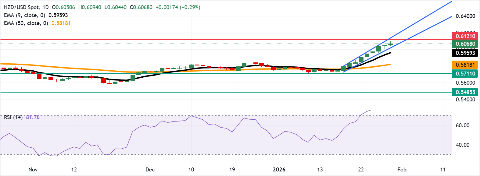 NZD/USD tiếp tục chuỗi thắng lợi bắt đầu từ ngày 16 tháng 1, giao dịch quanh mức 0,6080 trong giờ châu Âu vào thứ Năm. Phân tích kỹ thuật của biểu đồ hàng ngày cho thấy một xu hướng lạc quan liên tục khi giá cặp tiền này tăng trong mô hình kênh tăng dần.