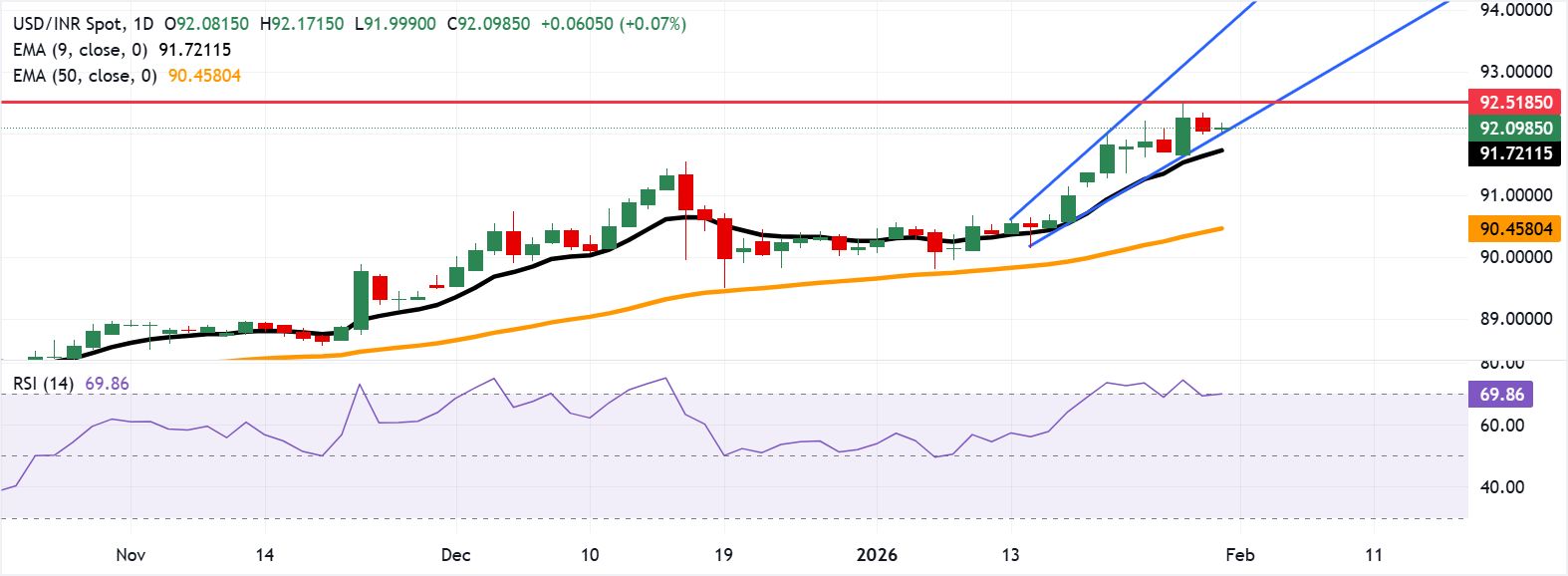Kháng cự ban đầu được nhìn thấy ở mức cao kỷ lục 92,51 vào ngày 28 tháng Giêng. Việc vượt qua mức này sẽ hỗ trợ cặp USD/INR tiến gần đến ranh giới trên của kênh tăng gần 93,60. Ở phía giảm, hỗ trợ ngay lập tức nằm ở mức hỗ trợ kênh thấp khoảng 92,00, tiếp theo là đường EMA chín ngày ở mức 91,71. Những đợt giảm thêm sẽ phơi bày đường EMA 50 ngày ở mức 90,46.