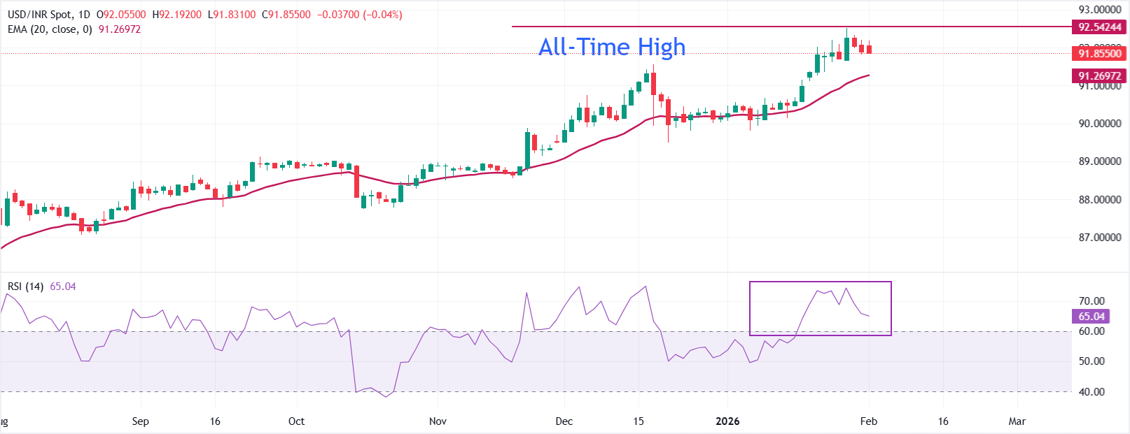 Rupee Ấn Độ (INR) tăng giá so với Đô la Mỹ (USD) trong phiên giao dịch mở cửa vào thứ Hai, sau thông báo ngân sách tài khóa (FY) 2026-27 của chính phủ Ấn Độ vào Chủ nhật. Cặp USD/INR giảm xuống gần 91,85 khi Ngân hàng Dự trữ Ấn Độ (RBI) đã can thiệp vào thị trường giao ngay và thị trường Hợp đồng tương lai không giao hàng (NDF) để cung cấp một lớp đệm cho Rupee Ấn Độ gần mức thấp nhất trong lịch sử so với Đô la Mỹ.