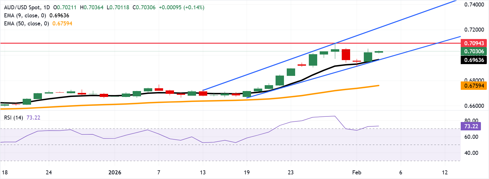 Cặp AUD/USD đang giao dịch quanh mức 0,7030 vào thứ Tư. Phân tích biểu đồ hàng ngày cho thấy cặp này vẫn nằm trong mô hình kênh tăng, cho thấy xu hướng tăng giá liên tục. Chỉ báo sức mạnh tương đối (RSI) trong 14 ngày ở mức 73,30; thường cho thấy đà tăng giá, nhưng đang kéo dài.