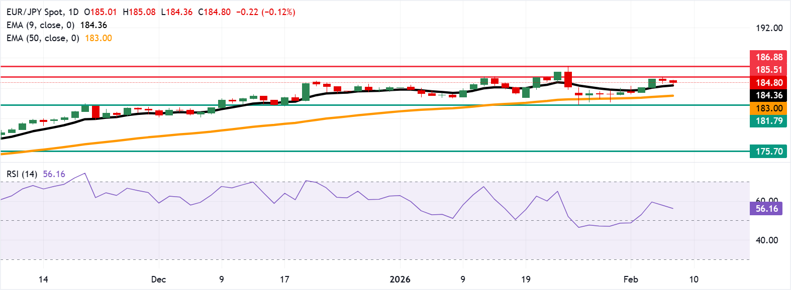 Dự báo giá EUR/JPY: Giảm về 184,50 gần mức hỗ trợ đường EMA chín ngày