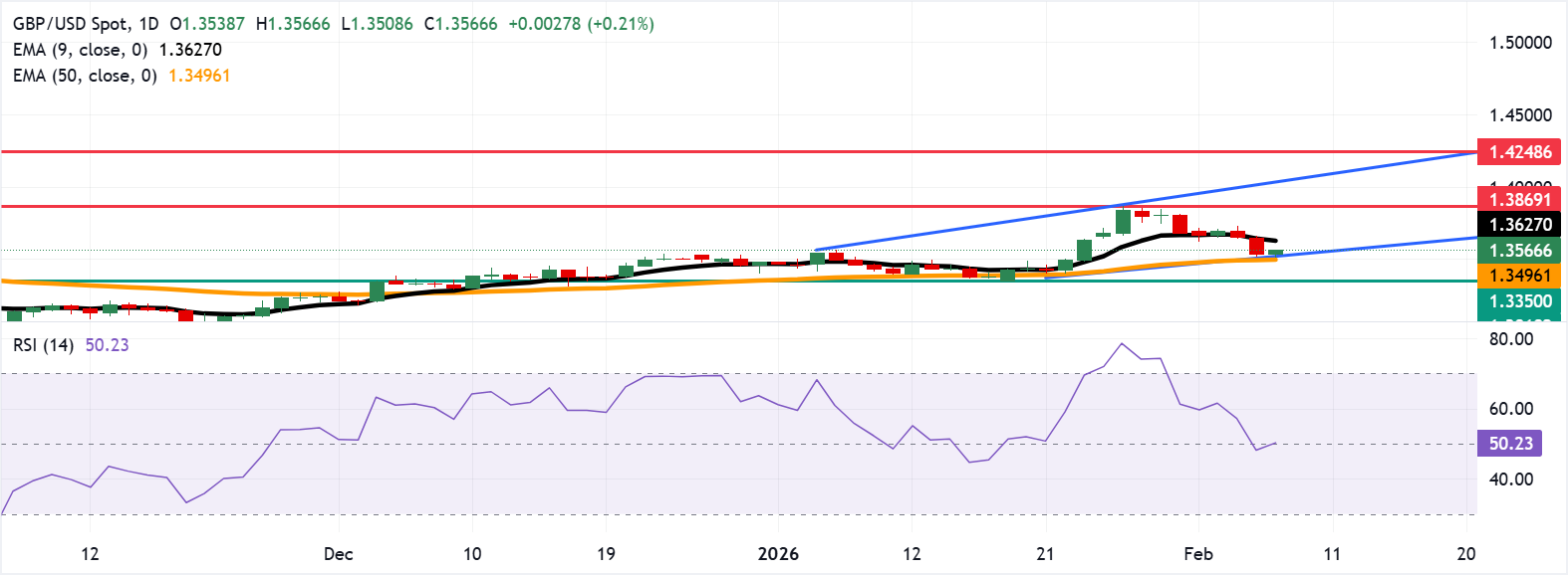 Cặp GBP/USD giữ trên đường trung bình động hàm mũ (EMA) 50 ngày đang tăng tại 1,3496, trong khi bị hạn chế bởi đường EMA 9 ngày tại 1,3626. Đường trung bình ngắn hạn đang lăn xuống, hạn chế mức tăng khi độ dốc trung hạn vẫn tích cực. Cấu trúc đường trung bình động giữ cho xu hướng rộng hơn được hỗ trợ, nhưng lực kéo ngắn hạn đang giảm và ủng hộ sự củng cố trước khi xu hướng tiếp tục.