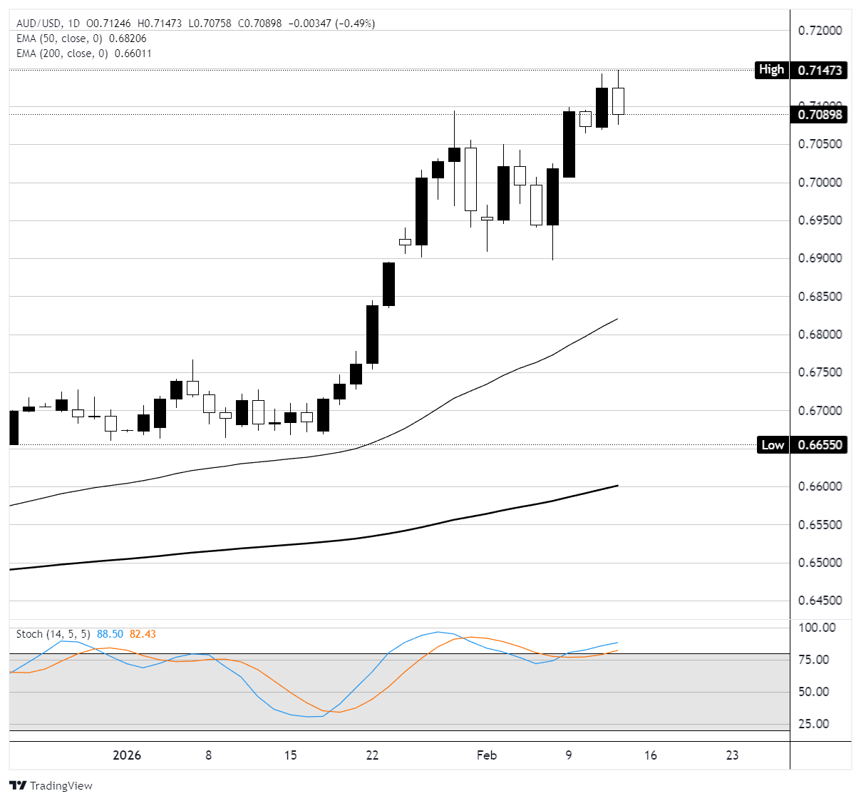 Về phía đồng đô la Mỹ, Bảng lương phi nông nghiệp (NFP) tháng 1 đạt 130K (trên mức đồng thuận 70K) trong khi tỷ lệ thất nghiệp giảm xuống 4,3%, làm dịu kỳ vọng về việc cắt giảm lãi suất của Cục Dự trữ Liên bang (Fed) trong thời gian tới. Nhìn về phía trước, việc công bố CPI của Mỹ tháng 1 vào thứ Sáu sẽ là yếu tố chính, với các nhà kinh tế dự báo CPI toàn phần ở mức 0,29% so với tháng trước và CPI cơ bản ở mức 0,39% so với tháng trước. Một con số yếu hơn có thể mở rộng sự khác biệt chính sách giữa Fed và RBA thêm nữa có lợi cho đồng đô la Úc.