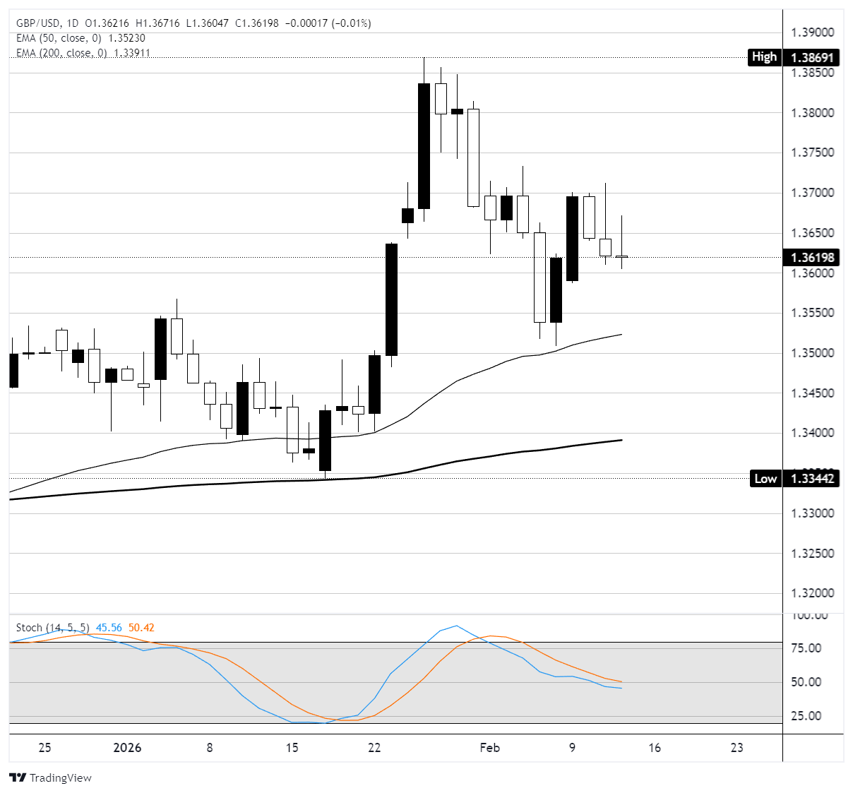 Đồng bảng Anh tăng nhẹ lên 1,3640 vào thứ Năm, phục hồi từ đợt thoái lui trước đó sau khi dữ liệu việc làm của Mỹ mạnh hơn mong đợi ban đầu đã gây áp lực lên cặp tiền này. Ngân hàng trung ương Anh (BoE) giữ lãi suất ở mức 3,75% trong cuộc họp ngày 4 tháng 2 với tỷ lệ bỏ phiếu sát sao 5-4, trong đó bốn thành viên ủng hộ việc cắt giảm 25 điểm cơ bản xuống 3,50%. Thống đốc Andrew Bailey đã bỏ phiếu cùng với đa số để giữ nguyên nhưng cho biết ông thấy "cơ hội cho một số nới lỏng thêm" và dự đoán "một sự sụt giảm mạnh trong lạm phát trong những tháng tới," với BoE dự báo CPI sẽ giảm trở lại mức mục tiêu 2% vào tháng 4. Dữ liệu Tổng sản phẩm quốc nội (GDP) quý 4 năm 2025 của Vương quốc Anh được công bố vào ngày 12 tháng 2 cho thấy tăng trưởng chỉ đạt 0,1%, với GDP hàng tháng cho tháng 12 cũng tăng 0,1%, xác nhận tốc độ chậm chạp của nền kinh tế Vương quốc Anh. Đồng bảng Anh đã tìm thấy một số hỗ trợ từ việc giảm bớt bất ổn chính trị trong nước sau khi Thủ tướng Keir Starmer nhận được sự ủng hộ từ các thành viên nội các cấp cao sau khi người đứng đầu văn phòng của ông, Morgan McSweeney, từ chức giữa vụ bê bối của Lord Peter Mandelson.
