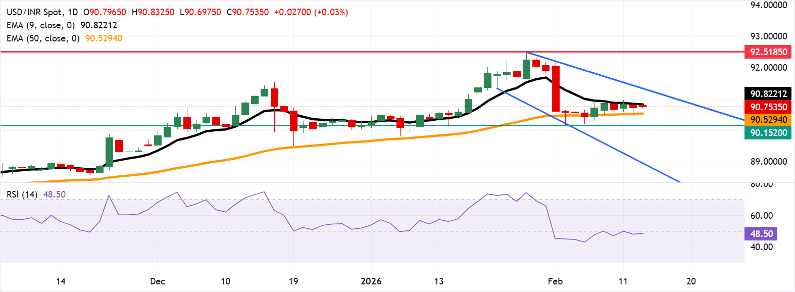 USD/INR đang giao dịch quanh mức 90,70 tại thời điểm viết bài. Phân tích biểu đồ hàng ngày cho thấy xu hướng giảm giá phổ biến, với cặp tiền này di chuyển trong một kênh giảm dần. Cặp tiền này nằm dưới đường trung bình động hàm mũ (EMA) chín ngày nhưng trên EMA 50 ngày, tạo thành một đợt thoái lui nông trong một xu hướng tăng rộng hơn. EMA 50 ngày tiếp tục tăng, trong khi EMA chín ngày giảm, cho thấy áp lực ngắn hạn nhưng nền tảng trung hạn vẫn còn nguyên vẹn. Chỉ báo sức mạnh tương đối (RSI) trong 14 ngày ở mức 48,72 là trung lập và đang tiến gần đến 50, cho thấy đà ổn định.
