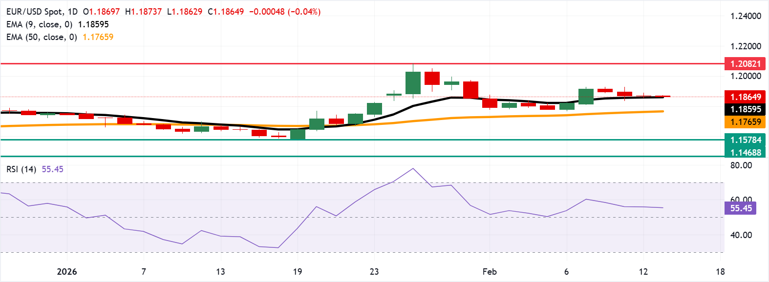Phân tích kỹ thuật của biểu đồ hàng ngày cho thấy cặp EUR/USD giữ trên đường trung bình động hàm mũ (EMA) 9 ngày và EMA 50 ngày, duy trì tâm lý tăng giá. Cả hai đường trung bình đều hướng lên, với đường trung bình ngắn hạn hỗ trợ cho đà tăng. Đường EMA 9 ngày nằm trên EMA 50 ngày, nhấn mạnh sức mạnh xu hướng ngắn hạn, trong khi sự tăng trưởng ổn định của EMA 50 ngày củng cố sự phục hồi trung hạn.