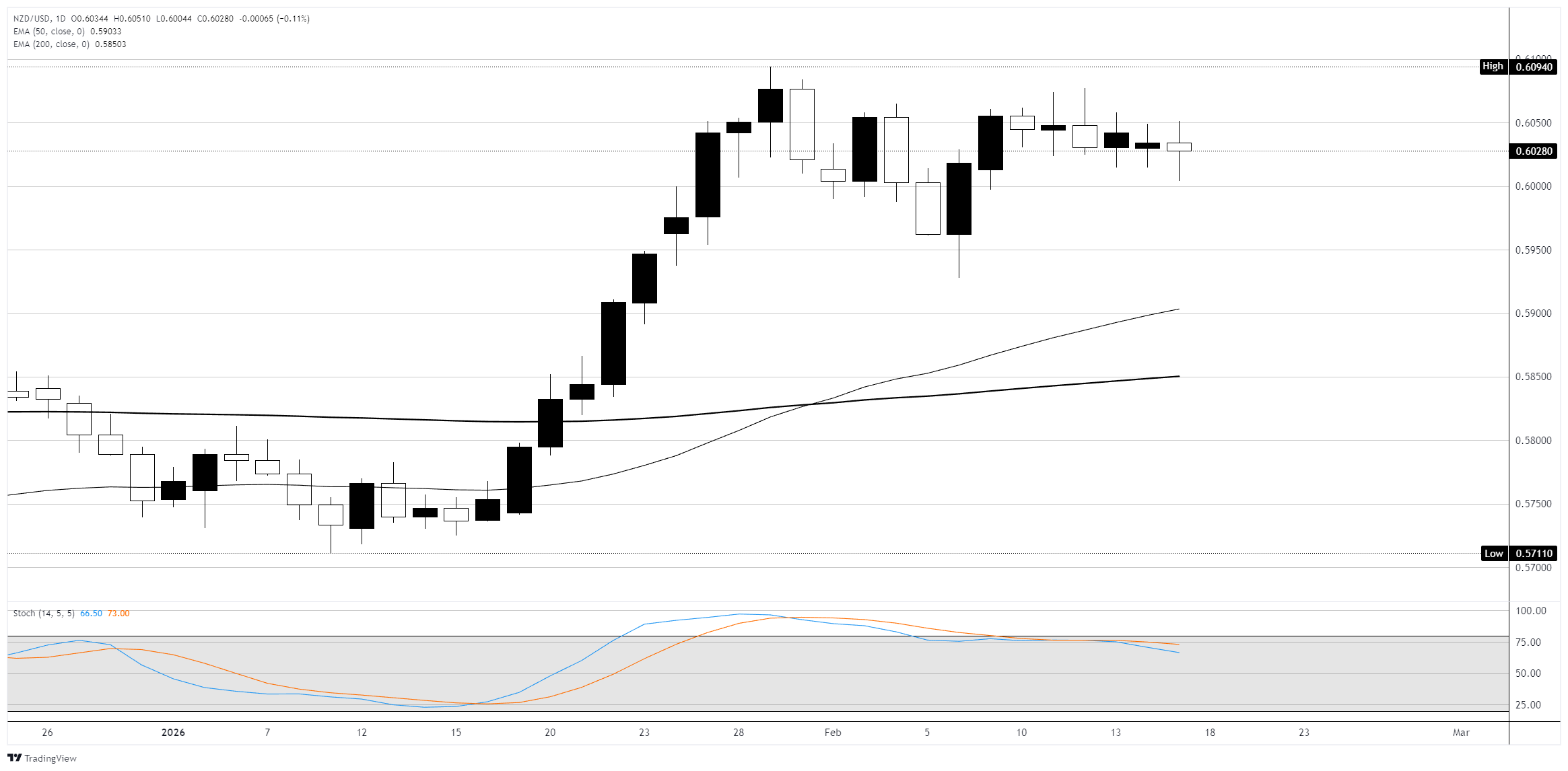 Trên biểu đồ hàng ngày, NZD/USD đang giao dịch gần 0,6037 vào thứ Ba sau khi củng cố trong một phạm vi hẹp dưới mức cao ngày 10 tháng 2 là 0,6065. Cấu trúc xu hướng rộng hơn là tăng giá, với giá giữ vững trên đường SMA 50 ngày ở mức 0,6047 và đường EMA 200 ngày ở mức 0,6029, cả hai đều đang có xu hướng tăng và hội tụ để cung cấp một cụm hỗ trợ động xung quanh vùng 0,6030 đến 0,6050. Chỉ số sức mạnh tương đối (RSI) 14 ngày đọc được 62, xác nhận động lực tích cực mà không có điều kiện quá căng thẳng, trong khi biểu đồ MACD đang giữ trên mức không.
