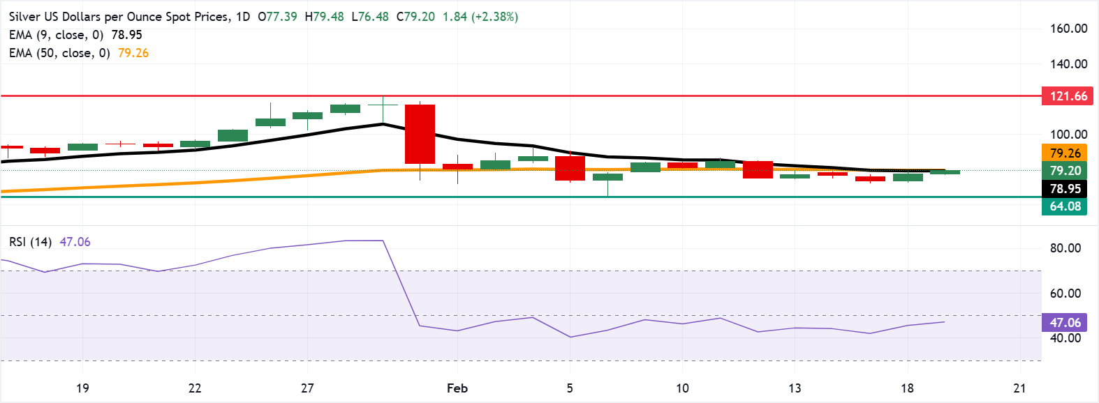 Về phía tăng, giá bạc đang kiểm tra rào cản ngay lập tức tại đường trung bình động hàm mũ 50 ngày ở mức 79,26$. Một đóng cửa hàng ngày trên đường trung bình trung hạn có thể củng cố động lượng và hỗ trợ cặp XAG/USD khám phá khu vực quanh mức cao kỷ lục 121,66$, đạt được vào ngày 29 tháng 1.