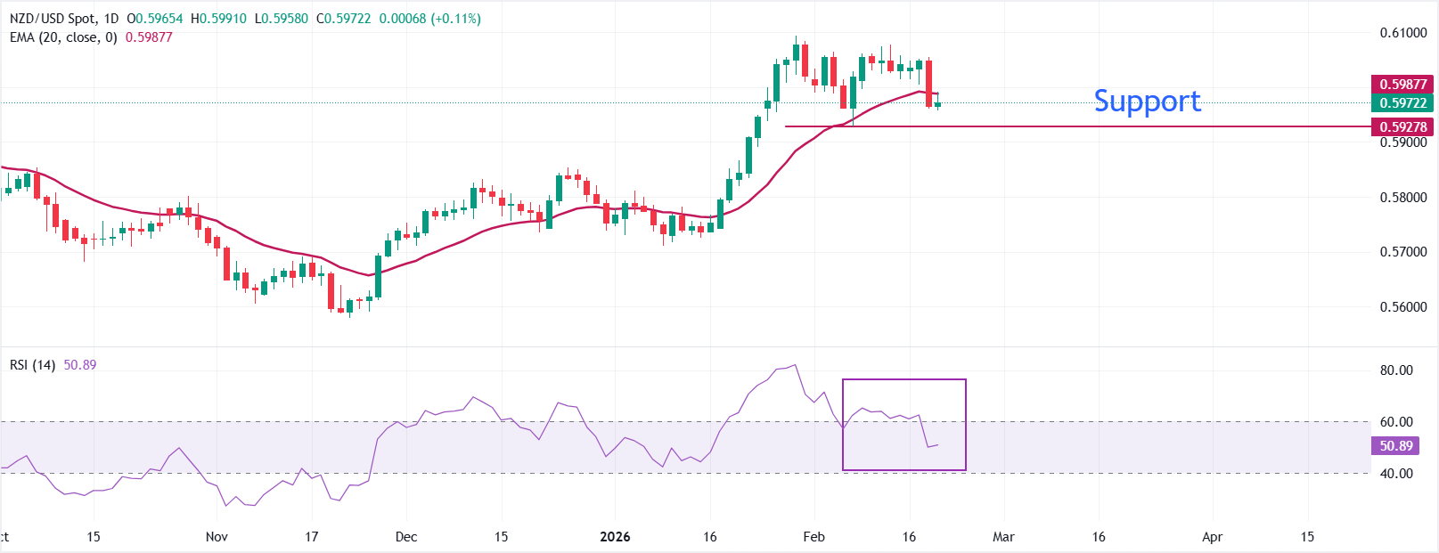 NZD/USD giao dịch nhích nhẹ lên khoảng 0,5973 tại thời điểm viết bài. Chỉ báo sức mạnh tương đối (RSI) 14 ngày ở mức 51 (trung lập) sau khi rút lui từ mức quá mua xác nhận rằng động lực đã giảm.