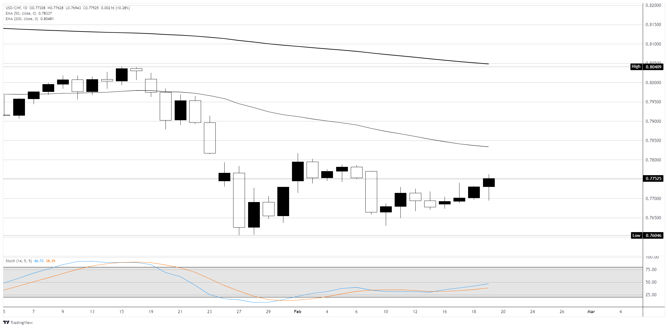 Trên biểu đồ hàng ngày, USD/CHF đã tăng trong phiên thứ tư liên tiếp vào thứ Năm, chạm mức cao tạm thời 0,7762 và tăng gần 0,3%, đạt mức cao nhất trong tám ngày giao dịch. Cặp tiền này tiếp tục giao dịch dưới đường trung bình động hàm mũ (EMA) 50 ngày đang giảm ở mức 0,7833 và EMA 200 ngày ở mức 0,8048, xác nhận xu hướng giảm rộng hơn đã diễn ra kể từ khi cặp này rút lui từ mức cao tháng 1 gần 0,8041. Chuỗi tăng bốn ngày đã nâng giá mua từ mức đáy swing ngày 14 tháng 2 gần 0,7680, phục hồi khoảng một nửa mức giảm của tuần trước.