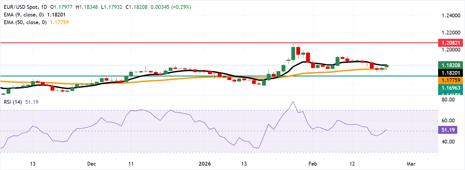 Phân tích kỹ thuật biểu đồ hàng ngày cho thấy cặp EUR/USD giữ vững trên đường EMA 50 ngày, duy trì xu hướng hỗ trợ chung. Đường EMA 9 ngày đã đi ngang gần mức hiện tại, làm giảm bớt khả năng tăng giá ngay lập tức.