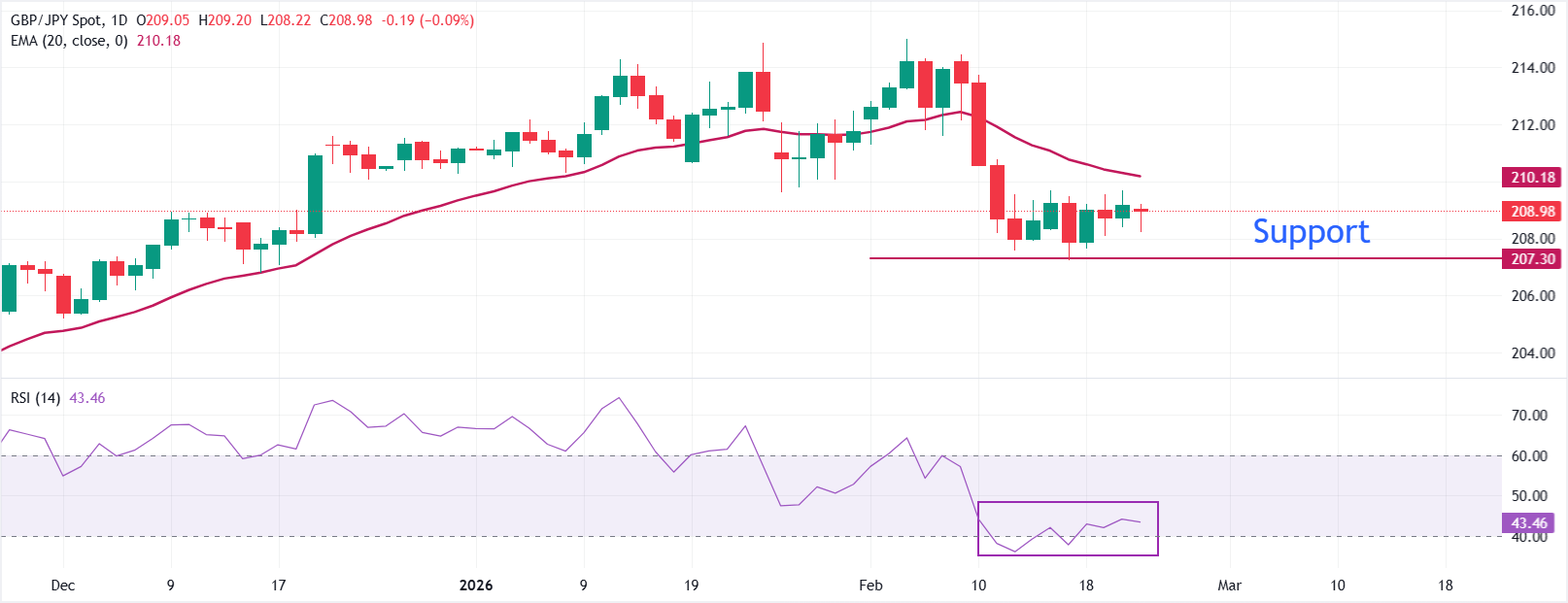 Cặp GBP/JPY giảm 0,11% xuống gần 208,80 trong phiên giao dịch châu Âu vào thứ Hai. Cặp tiền này phải đối mặt với áp lực bán khi phán quyết của Tòa án Tối cao Hoa Kỳ chống lại chính sách thuế quan của Tổng thống Donald Trump đã cải thiện nhu cầu trú ẩn an toàn của đồng Yên Nhật (JPY).