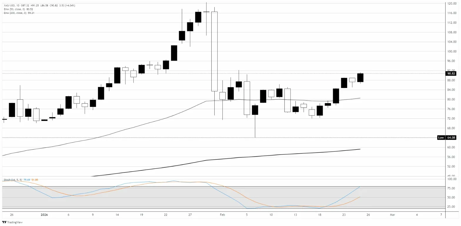 XAG/USD đã tăng khoảng 4% vào thứ Ba, phục hồi mạnh mẽ để đóng cửa gần 91$ trong một phiên giao dịch được thúc đẩy bởi nhu cầu trú ẩn an toàn mới. Cặp tiền này đã phục hồi từ cú sập vào cuối tháng Giêng, khi giá giảm từ mức cao kỷ lục trên 121$ xuống mức thấp khoảng 64$ vào đầu tháng Hai, giảm khoảng 47%. Kể từ khi chạm đáy, giá bạc đã hình thành một mô hình nền với một loạt các mức thấp hơn cao hơn giữa khoảng 76$ và 90$ trong ba tuần qua, và cây nến tăng mạnh vào thứ Ba đã đẩy giá trở lại trên mức 90$ lần đầu tiên kể từ đợt bán tháo.
