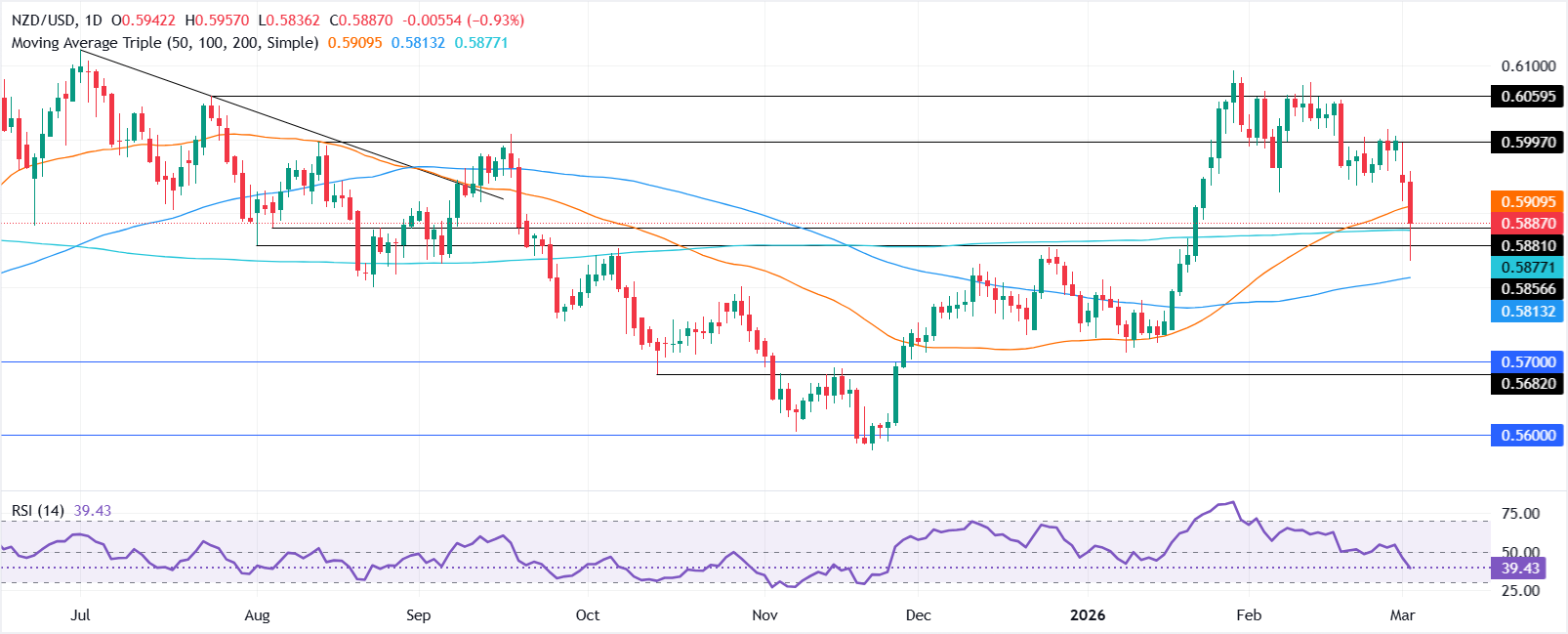 Bức tranh kỹ thuật của Kiwi vẫn có xu hướng tăng sau khi thử nghiệm tạm thời đường trung bình động giản đơn (SMA) 200 ngày ở khoảng 0,5874, leo lên trên mức này và kết thúc phiên gần với mức 0,5900.
